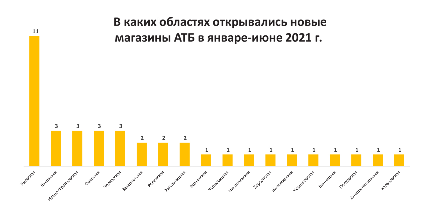 На западе Украины в первом полугодии 2021 года было открыто 14 новых магазинов сети АТБ. Из них, на Львовщине и Ивано-Франковщине —3 объекта, на Закарпатье, Ровенщине и в Хмельницкой области — по 2 магазина, а на Волыни и в Черновицкой области открылось по одному новому "АТБ-маркету«.