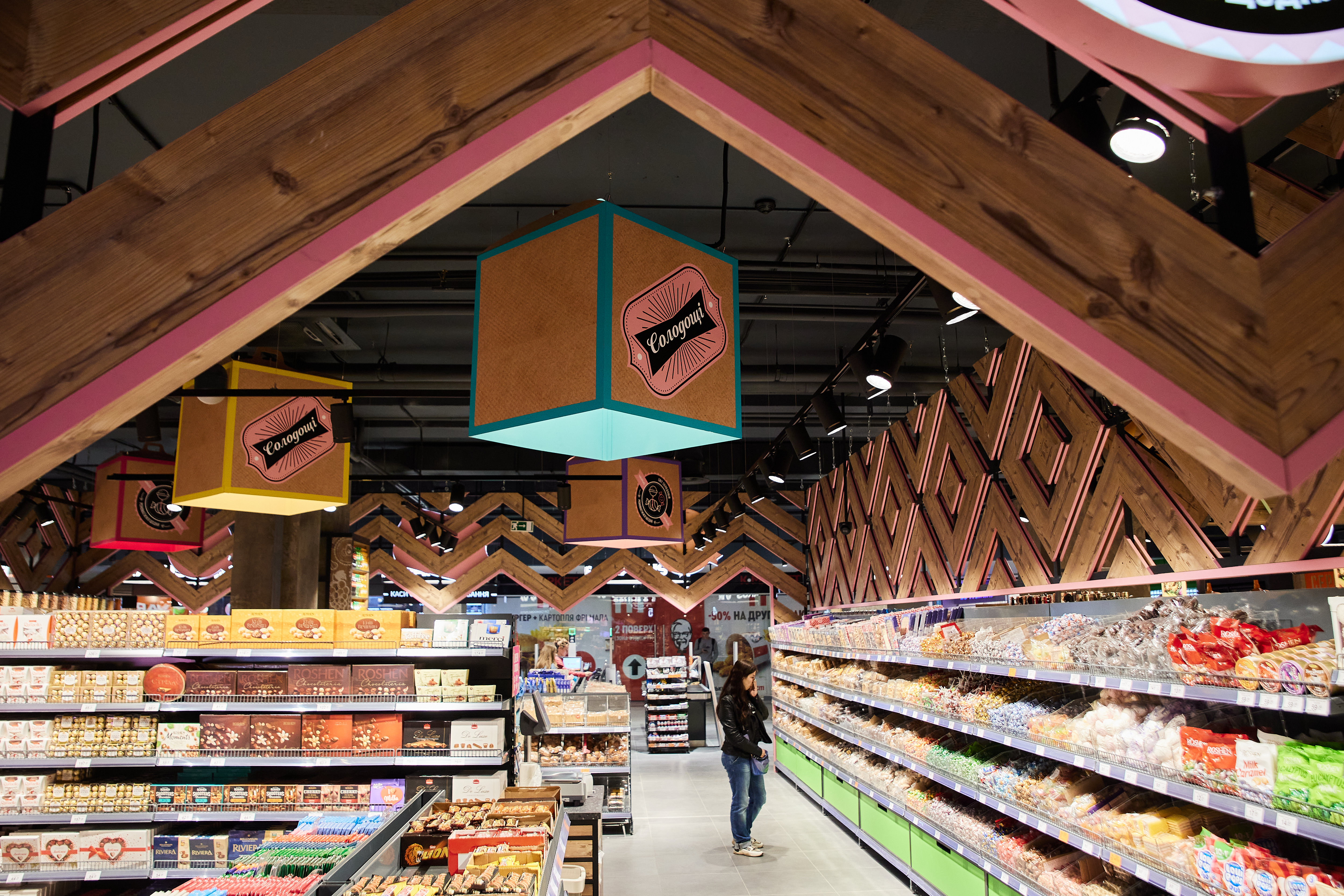Отделы вина, сладостей, молочной продукции и пива выделены специальными конструкциями. Винный отдел освещают фонари-бочки. Сладости в теплом освещении фонарей-коробок. Молочные и пивные отделы украшают стилизованные бидоны и кеги.