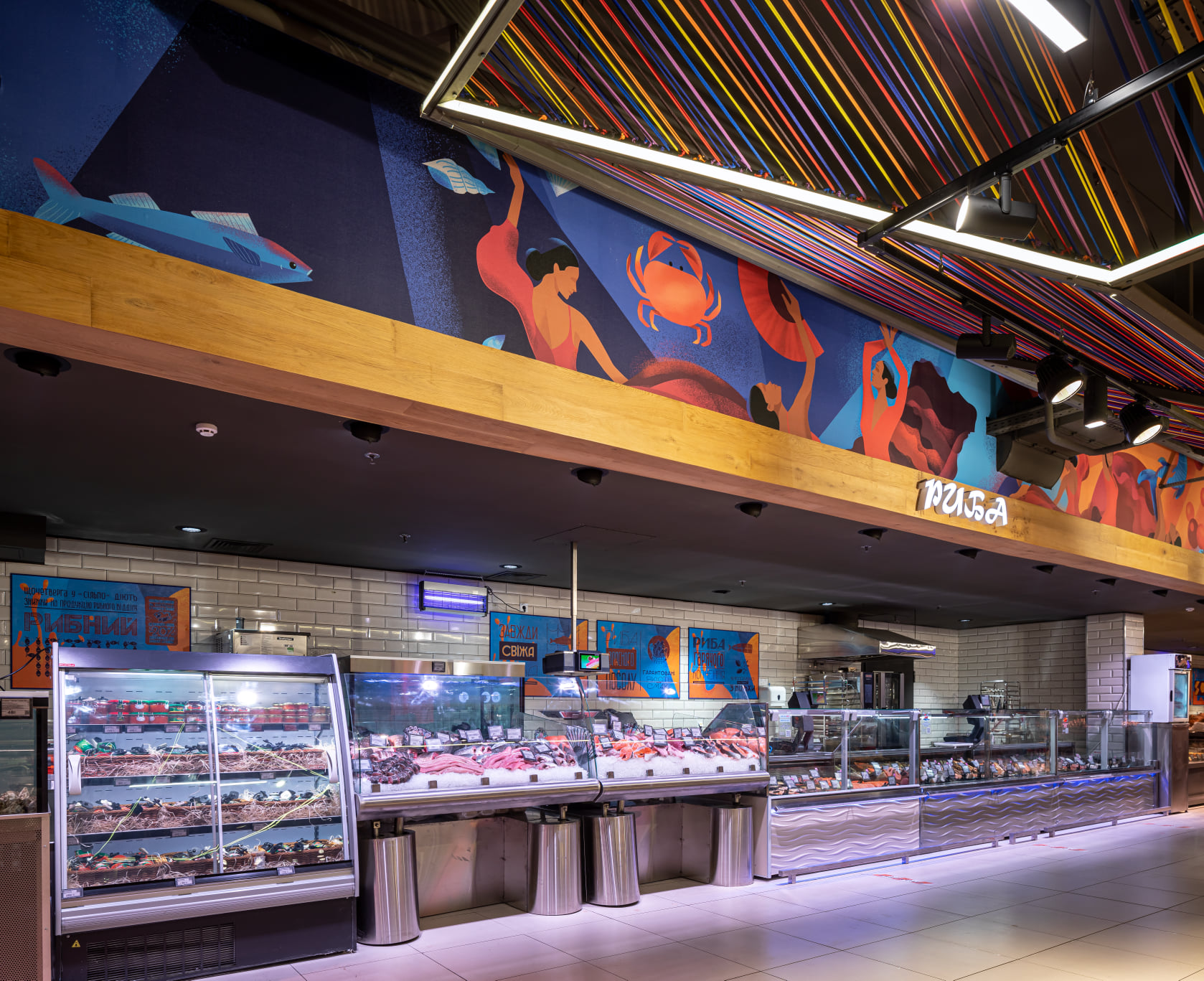 Магазин в стиле фламенко просторным – его площадь 2660 квадратных метров. Здесь работает рыбный отдел, в котором есть все – свежая, копченая, соленая рыбка и даже аквариум с устрицами. В мясном цехе идет подготовка мяса, чтобы гости могли воплотить самые разные рецепты. Тем временем в отдельном специальном шкафу созревают будущие сочные стейки.