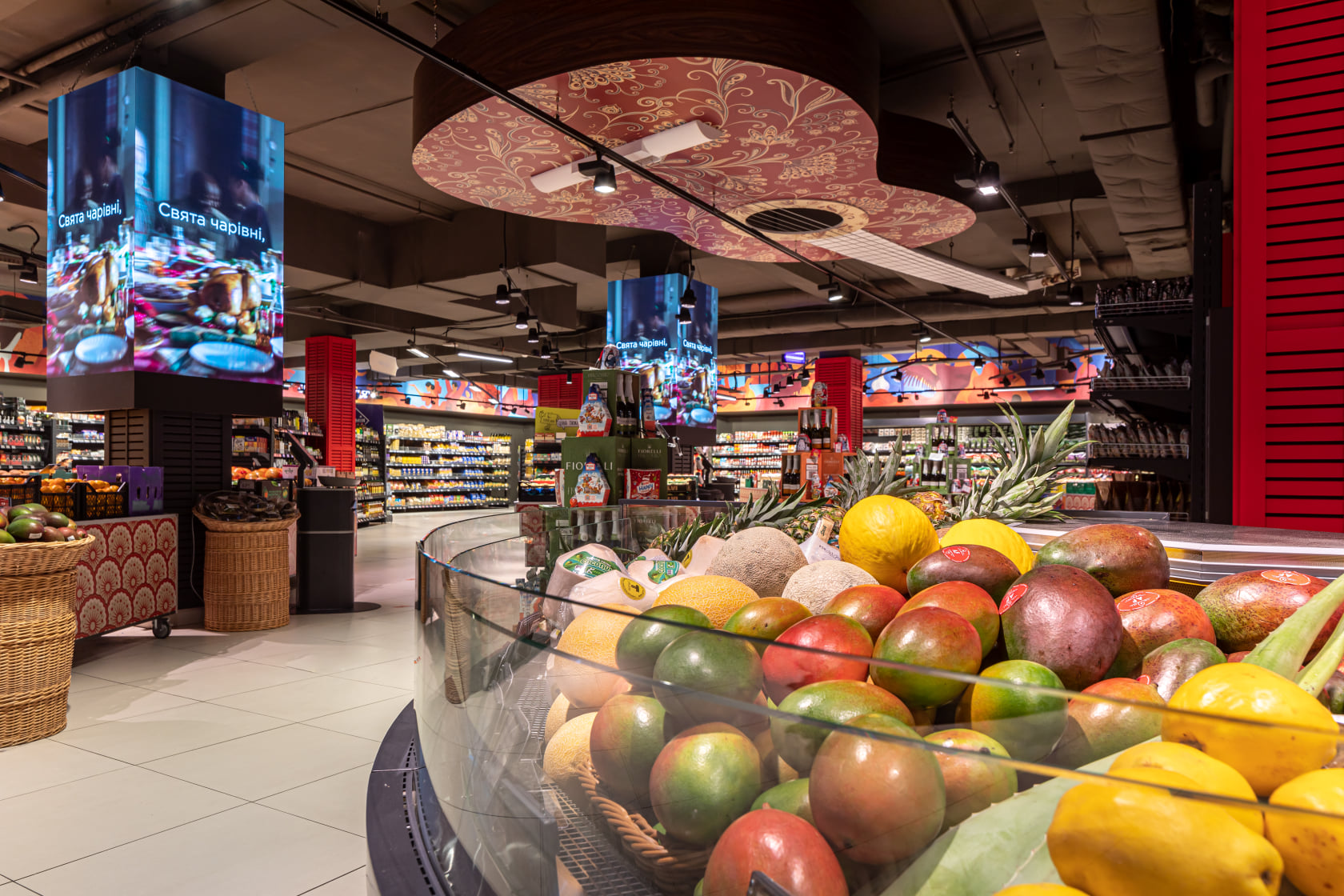 Дизайн нового магазина посвятили страстному и яркому испанскому фламенко. Это сочетание музыки и пляски, эмоций и характера. Интерьер супермаркета наполнили красные колонны в виде деревянных ставен, иллюстрации с танцовщицами фламенко в ярких пышных платьях, а также важный атрибут испанского танца – веера.