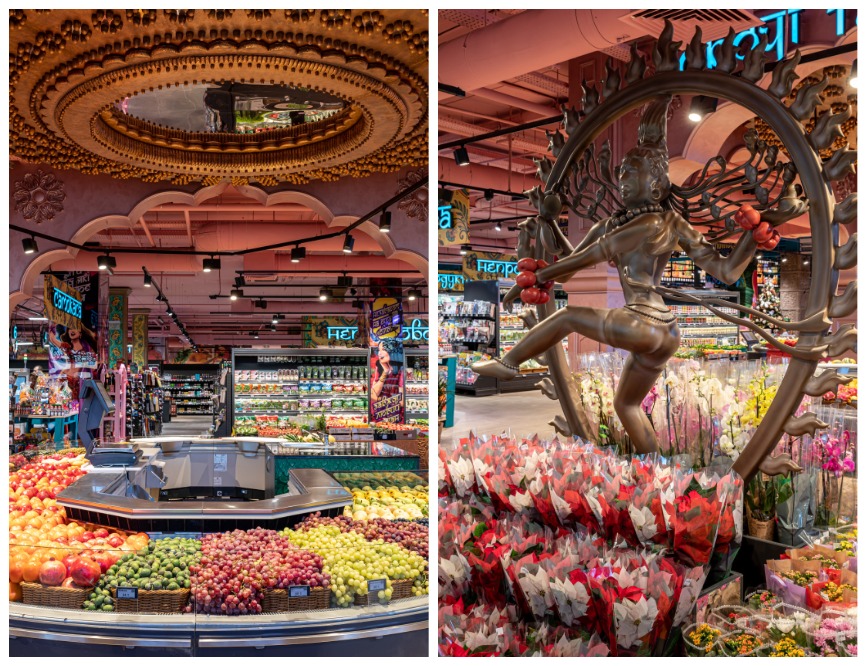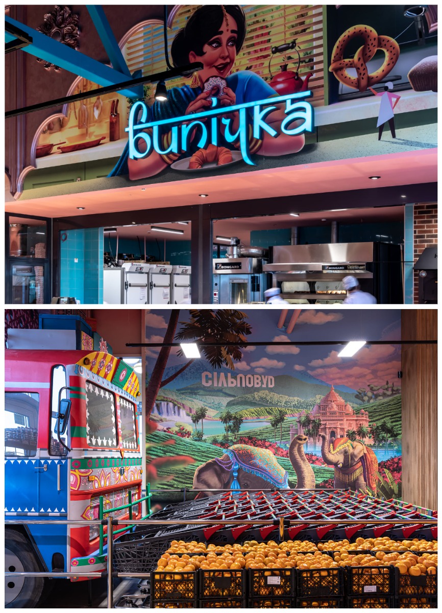 Вдохновением для создания супермаркета стал Болливуд. В магазине смешалась вся палитра индийской культуры: кадры и иллюстрации по фильмам, постеры, танцы и розово-зеленые узоры. На входе гостям приветливо машет хоботом самое уважаемое священное животное слон с вывеской «Сільпо». А в путешествие по индийскому кинематографу можно отправиться на ярком автобусе, который стоит у входа.