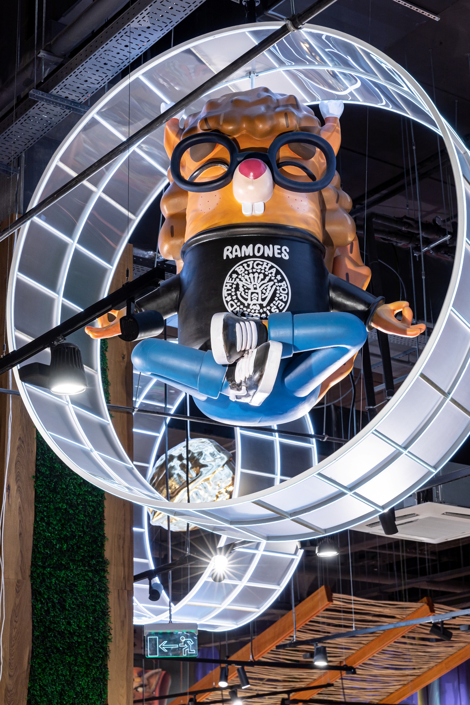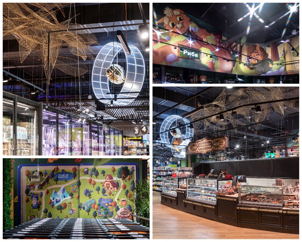 Героями интерьера нового «Сільпо» стали лес и звери. Например, персонажи книги наблюдают за гостями из дерева во фруктово-овощном отделе, а в колесе под потолком медитирует главная героиня — Белка-Детективка. Она напоминает, как важно замедлиться и без суеты выбрать из огромного ассортимента именно те продукты, которые вам придутся по вкусу.