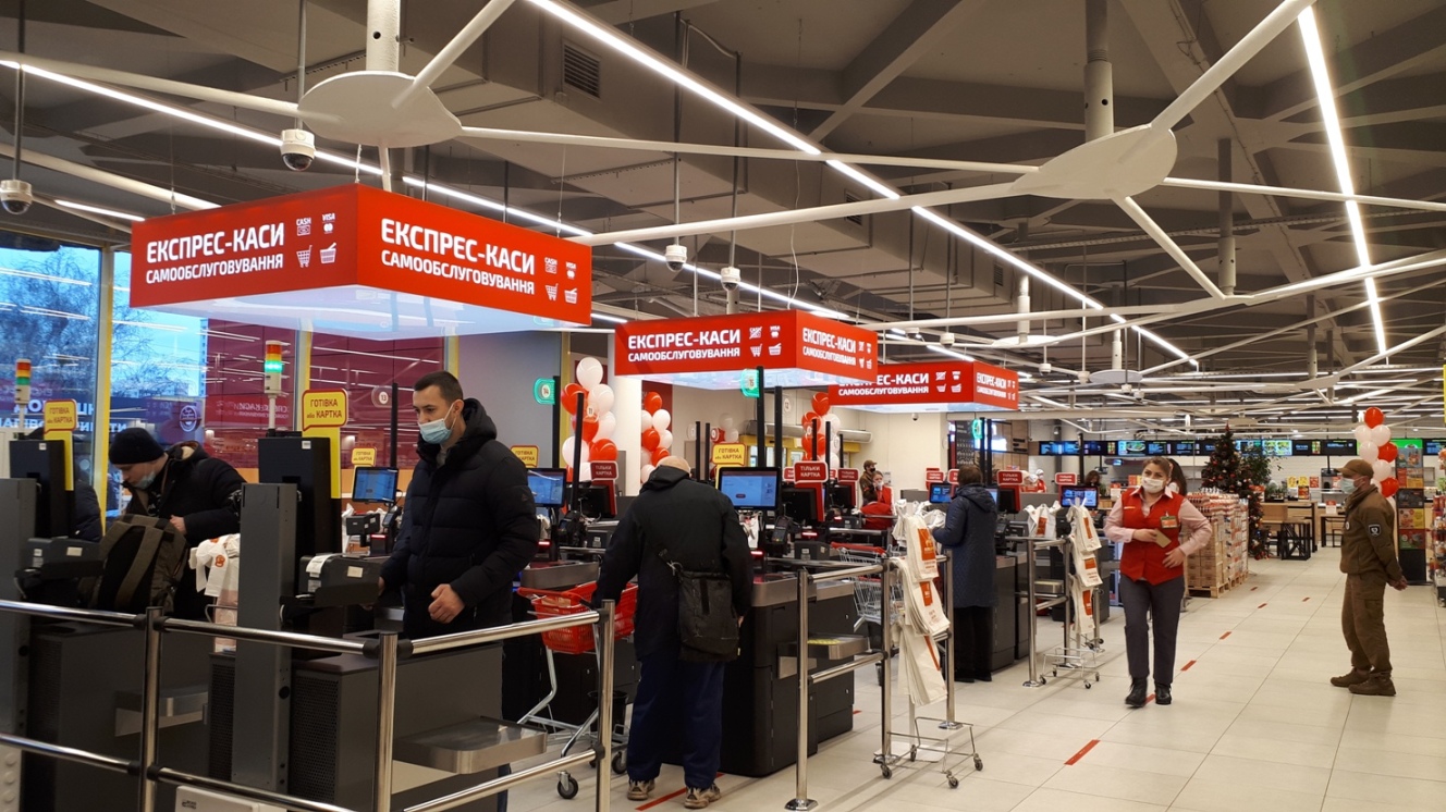 В новом «Велмарт» на Леся Курбаса установили линию касс с биоптическими сканерами, которые позволяют быстрее обслуживать покупателей, к кассам самообслуживания добавили оборудование Glory — систему, принимающую к оплате наличные.