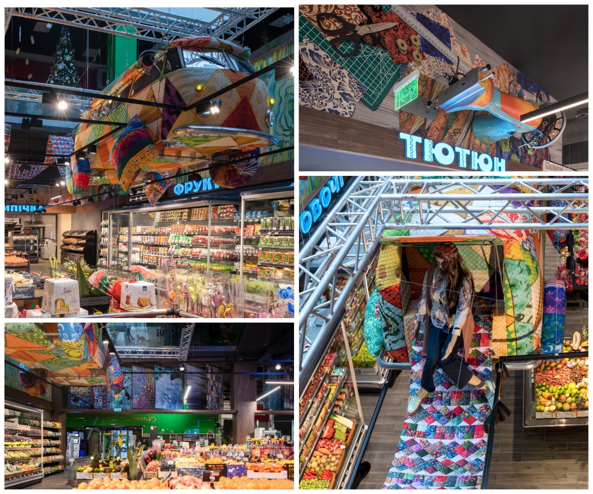 Работая над концепцией открытого зимой магазина, в компании стремились создать теплый и мягкий интерьер. А что может добавить больше уюта, чем красивое разноцветное одеяло? Так тематикой оформления нового супермаркета стало лоскутное шитье, а именно квилт. Команда «Сільпо» создала интерьер с большим количеством лоскутных подушек и стеганых одеял с теплым наполнителем, выполненным в этой технике.