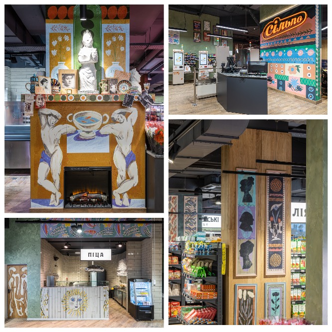 Вход в супермаркет расписал художник, а в самом магазине можно найти арфу. Дополняет атмосферу нового «Сільпо» декорированный камин. У похожего камина в чарльстонском доме сто лет назад собирались за интеллектуальными беседами писательница Вирджиния Вулф и другие участники блумсберийского кружка. Уют таким встречам добавляли чай или душистый кофе.