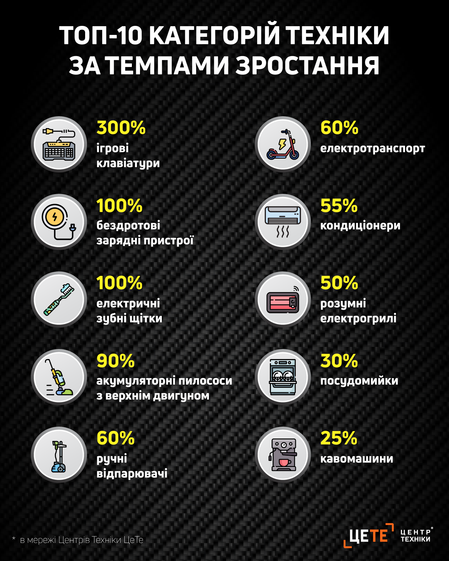 В ЦеТе также отмечают, что из-за глобальных процессов, связанных с пандемией коронавируса, на украинском рынке наблюдался дефицит в отдельных категориях товаров, таких как ноутбуки, игровые приставки и мелкая бытовая техника. Несмотря на такие неутешительные тенденции, многие категории потребительской электроники в прошлом году значительно выросли. Например, продажи товаров бренда Apple увеличились в 6 раз, игровых клавиатур – в 4 раза, беспроводных зарядных устройств – вдвое, а электротранспорта – на 60%.