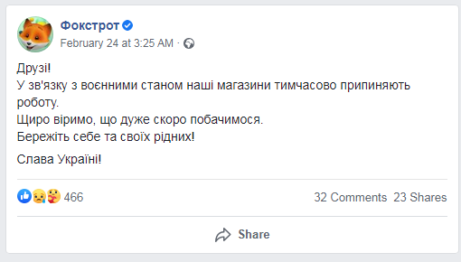 "С четверга все магазины Фокстрота временно прекратили работу. Служба доставки также не работает по известным, к сожалению, всем причинам. Надеемся, этот ужас скоро закончится и со стабилизацией ситуации мы возобновим работу. Соответственно — будут выполнены все заказы по доставке. Верим в победу и в наши ЗСУ!".
