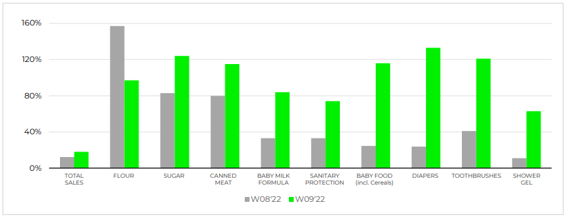 На девятой неделе года наблюдается сильная динамика (W09’2022 против W09’2021) таких категорий продуктов: сахар (+124%), мясные консервы (+115%) и мука (+97%). Наибольшее ускорение и рост товарооборота зафиксированы в категориях личной гигиены и питания для детей.