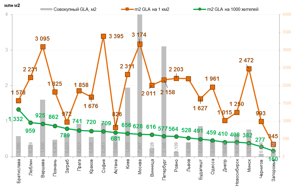 По уровню насыщенности торговыми площадями на 1000 жителей Киев (658,0 м2) обогнал главные торговые столицы СНГ: Москву (604,2 м2), Санкт-Петербург (570,8 м2) и ряд городов Украины приближаются к значениям большинства городов Восточной Европы.