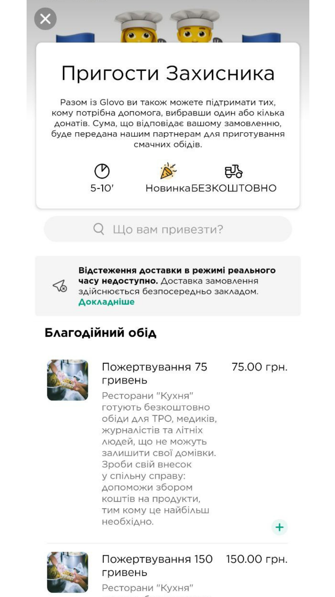 Теперь пользователи приложения Glovo на территории всей Украины могут поддержать инициативу благотворительных обедов от Кухня Delivery. Для этого нужно в баббле «Допоможи Україні!» выбрать опцию «Пригости Захисника» и размер донейта, который варьируется от 75 до 7 тысяч гривен. После подтверждения заказа сумма будет списана с платежной карты пользователя. Собранные средства пойдут на закупку продуктов для приготовления благотворительных обедов на облачных кухнях Кухня Delivery.