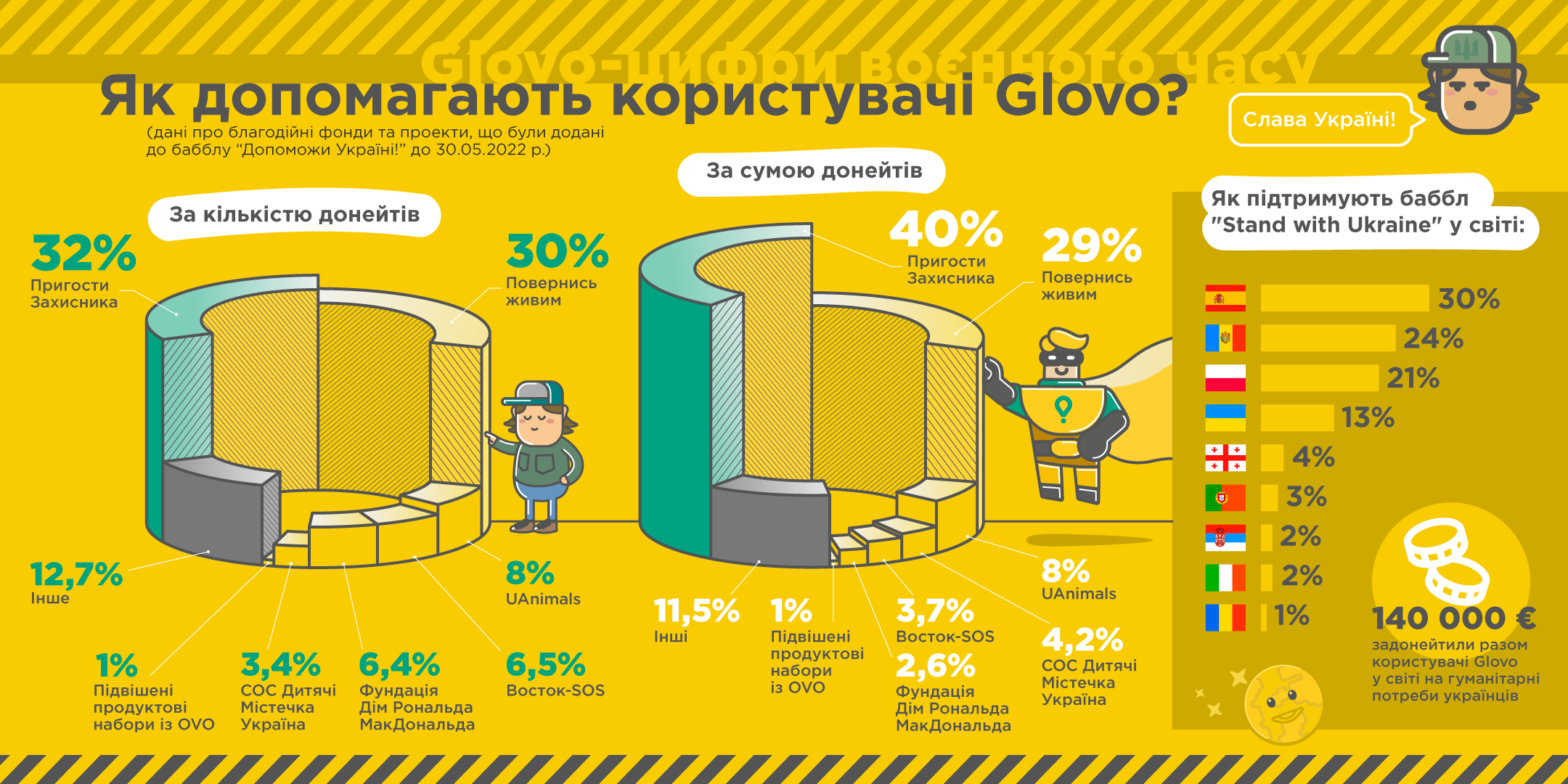 Не меняется внимание пользователей и к новому бабблу на платформе «Помоги Украине!». Чуть больше, чем за три месяца работы, украинским пользователям удалось собрать более 600 тыс. гривен, которые распределились между благотворительными организациями, присутствующими в приложении. По количеству и размеру взносов за это время больше всего посылали помощь в «Вернись живым», «Угости Защитника» и UAnimals. За все время работы благотворительного бабба за рубежом пользователи Glovo вместе собрали более 140 тысяч евро, а больше вкладов на гуманитарные нужды украинцев внесли пользователи в Испании, Румынии и Польше. Кроме этого, украинский офис Glovo передал в «Вернись живым» еще 1,7 млн грн (всего уже 6,6 млн грн за период с 24 февраля).