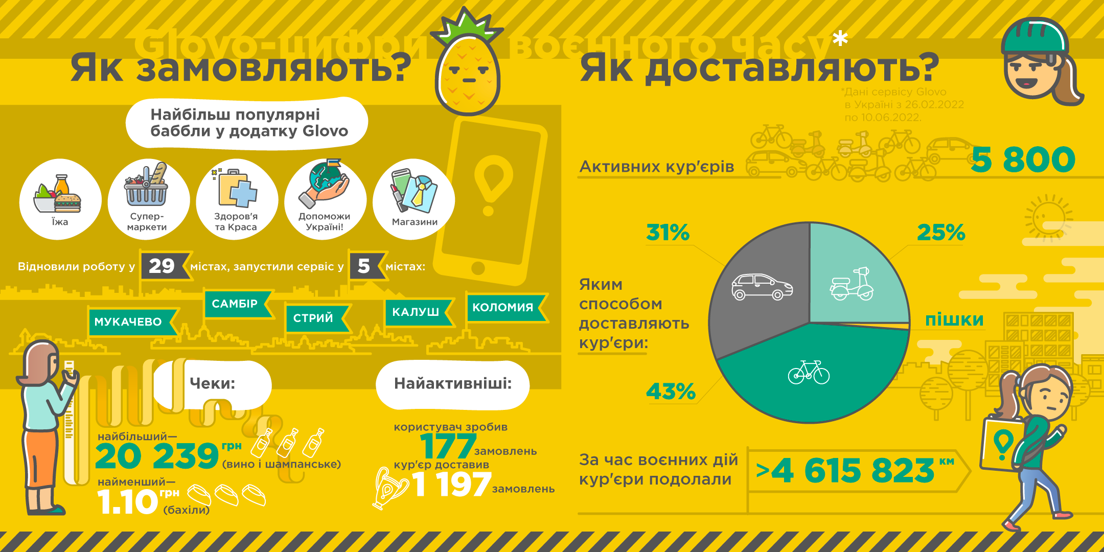 Благодаря гибкости бизнес-модели Glovo, а именно возможности максимально ограничить влияние внешних факторов на скорость доставки, пользователи продолжают получать свои заказы менее чем через час, несмотря на пробки или дефицит горючего. Учитывая географию городов и особенности инфраструктуры, сервис распределяет курьеров с разным видом транспорта так, чтобы не только сохранять, но и улучшать скорость доставки. Сегодня на платформе уже 5800 активных курьеров, из которых 43% доставляют заказы на велосипедах, 31% и 25% на авто и мопедах соответственно, остальные — пешком. А всего за время военных действий курьеры успели преодолеть 4.6 млн км.