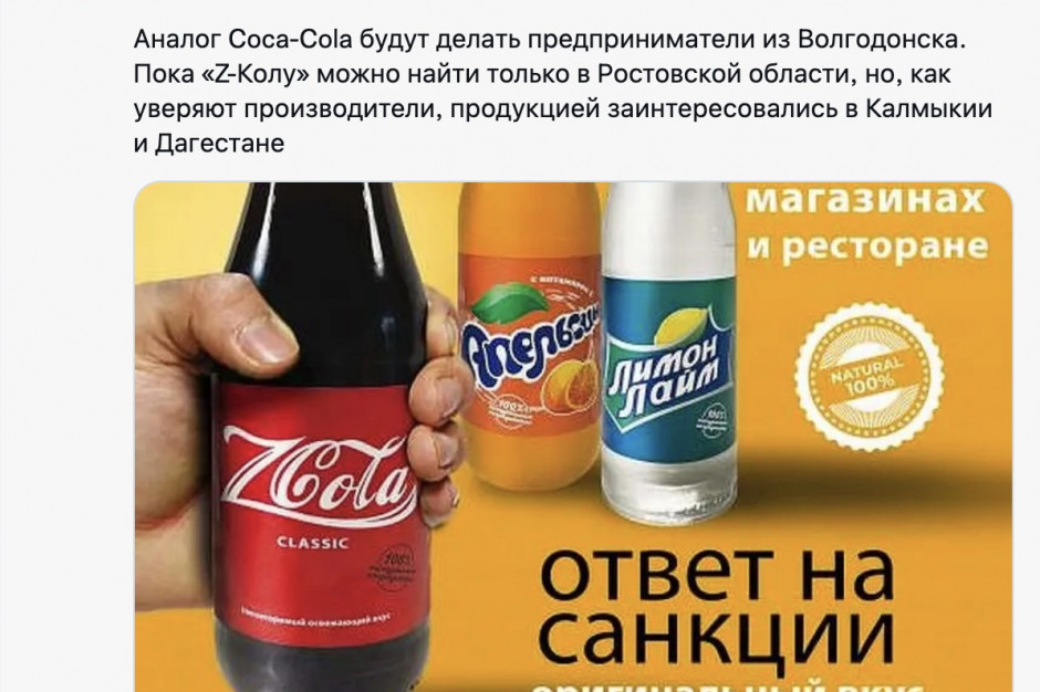 В твиттере русскоязычная версия «Белсата» «Вот так» сообщает, что производство «Z-Cola» стартует в Ростовской области. Продукция также будет поставляться в пограничные с Грузией Калмыкию и Дагестан. Это очередной ответ РФ на действия концерна Coca-Cola, в марте приостановившего свою деятельность в этой стране.