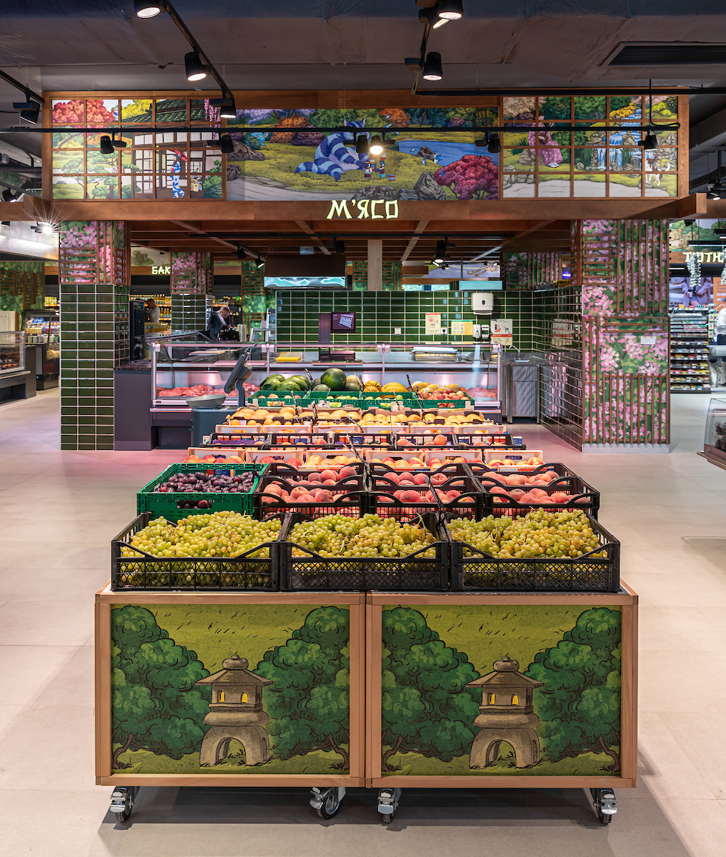 В «Сільпо» с концепцией японского сада мы стремились создать уютный и спокойный интерьер. Дизайн магазина воспроизводит близость к природе, чтобы помочь помедитировать за шоппингом, восстановить силы и обрести гармонию. Дизайн магазина погружает в японскую философию с тщательно подобранными композициями из камней, иллюстрациями формованных деревьев, японскими сакурами, фонариками и кассами в виде габионов.