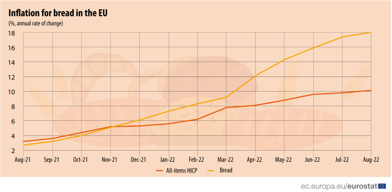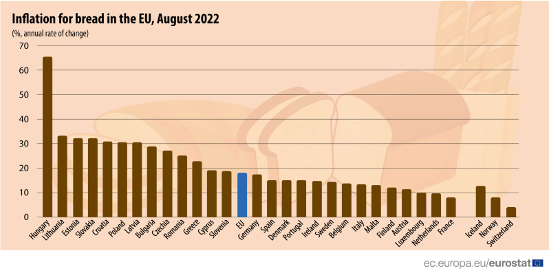 Одной из причин дорогостоящего хлеба в Европе является вторжение России в Украину, потрясшее мировые рынки зерновых, растительных жиров и искусственных удобрений. Обе страны являются ведущими экспортерами пшеницы, кукурузы, подсолнечного масла и удобрений. В августе 2022 года цены на хлеб в Евросоюзе выросли в среднем на 18% по сравнению с августом 2021 года. Это огромное изменение, учитывая, что годом ранее хлеб подорожал на 3%. Также в месячном измерении цены значительно повысились с показателем +10%, когда в «пандемийном» 2021 году цены в августе были всего на 3%, чем в июле.