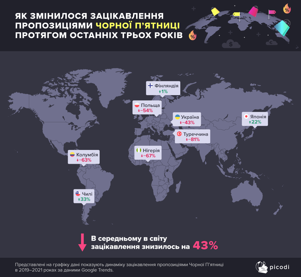 Чтобы проверить, как изменился интерес к распродажам на Черную пятницу, воспользовали данными платформы Google Trends, взяв за пункт отсчета предпандемический 2019 год. В большинстве стран, включенных в рейтинг, количество связанных с Black Friday запросов уменьшилось. В Украине интерес покупателей снизился на 43% (данные за 2021 г. по сравнению с 2019 г.). Скорее всего, это связано не только с пандемией и нестабильной финансовой ситуацией, но и с чрезмерным использованием терминов Black Friday и Black Week для любых распродаж, кроме основных в конце ноября. Однако есть страны, в которых, несмотря на пандемию, заинтересованность акциями и скидками на Черную пятницу увеличилась. Это Чили (+33%), Япония (+22) и Финляндия (+1%).
