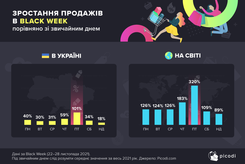 Хотя сейчас интерес к Черной пятнице как никогда низкий, распродажи в конце ноября — это самое горячее время для украинской онлайн-торговли. 26 ноября 2021 г. объем продаж увеличился на 101% по сравнению с обычным днем, а в другие дни так называемой чернопятничной недели этот показатель колебался между 18% и 59%. В свою очередь в странах, где работает сервис Picodi, в Черную пятницу количество продаж возросло в среднем на 320%.