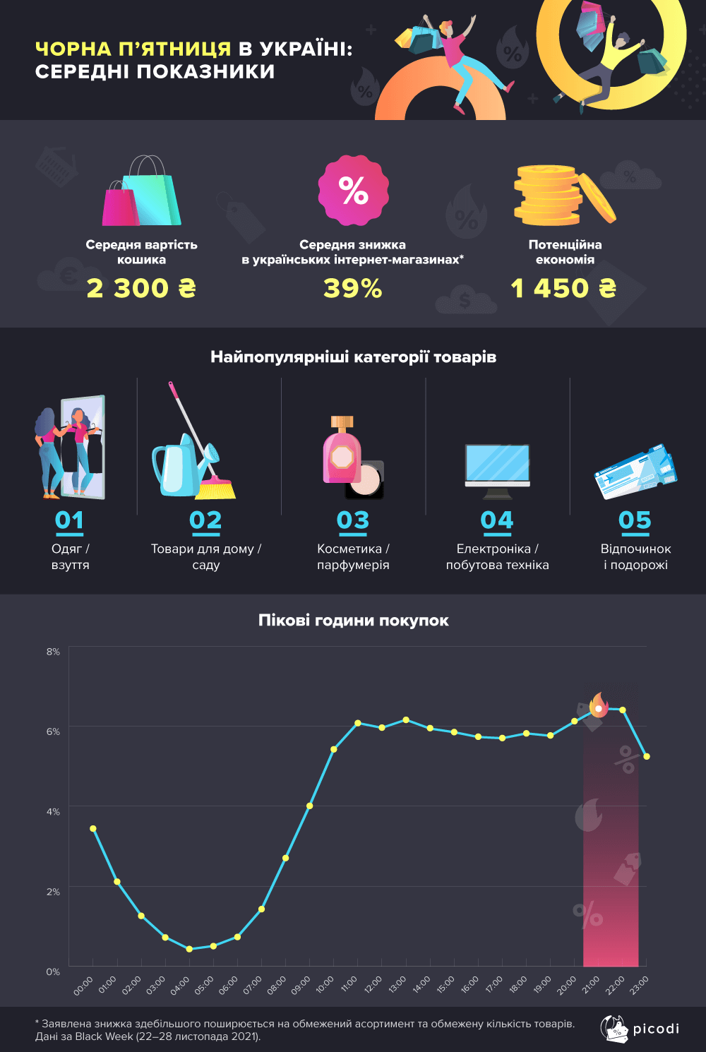 У украинцев, которые делали покупки во время распродаж в конце ноября 2021 г., наиболее популярны были следующие категории: одежда и обувь, товары для дома, косметика, электроника и бытовая техника, отдых/путешествия (билеты, отели). При этом средняя стоимость покупок была равна 2 300 ₴, а размер полученной скидки — 39%, что позволило покупателям сэкономить 1 450 грн. Следует отметить, что предлагаемые магазинами скидки охватывали ограниченный ассортимент и количество товаров.