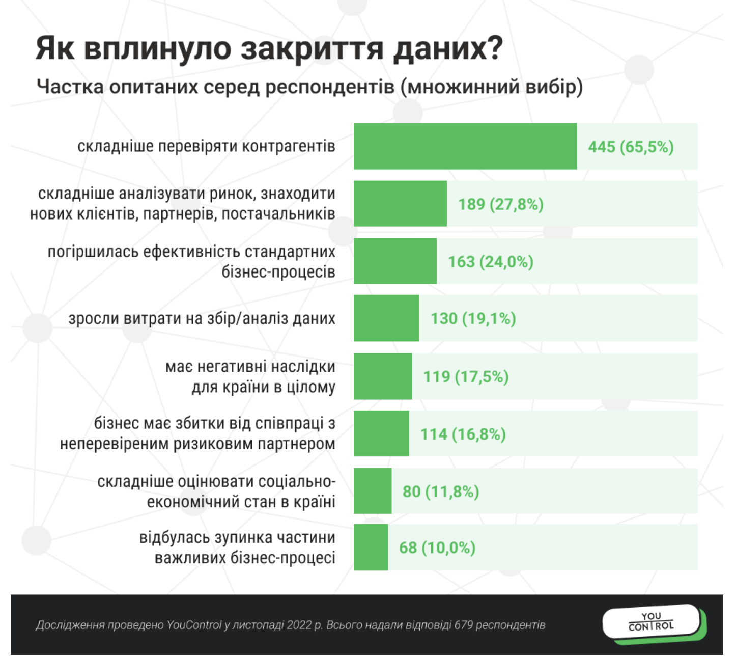 Наиболее часто отмечен ответ «появились существенные сложности с проверкой контрагентов». О таком негативном факторе отметили 66% респондентов из 679 человек, ответивших на данный вопрос. Также распространена проблема анализа рынков, поиска новых клиентов, партнеров и поставщиков — 28%. Для 24% ухудшилась эффективность стандартных бизнес-процессов. Также среди существенных проблем: рост расходов на сбор и анализ данных, ущерб бизнесу от сотрудничества с непроверенными рисковыми партнерами, остановка части важных бизнес-процессов. 18% респондентов отметили, что закрытие ряда публичных реестров имеет негативные последствия для страны в целом.