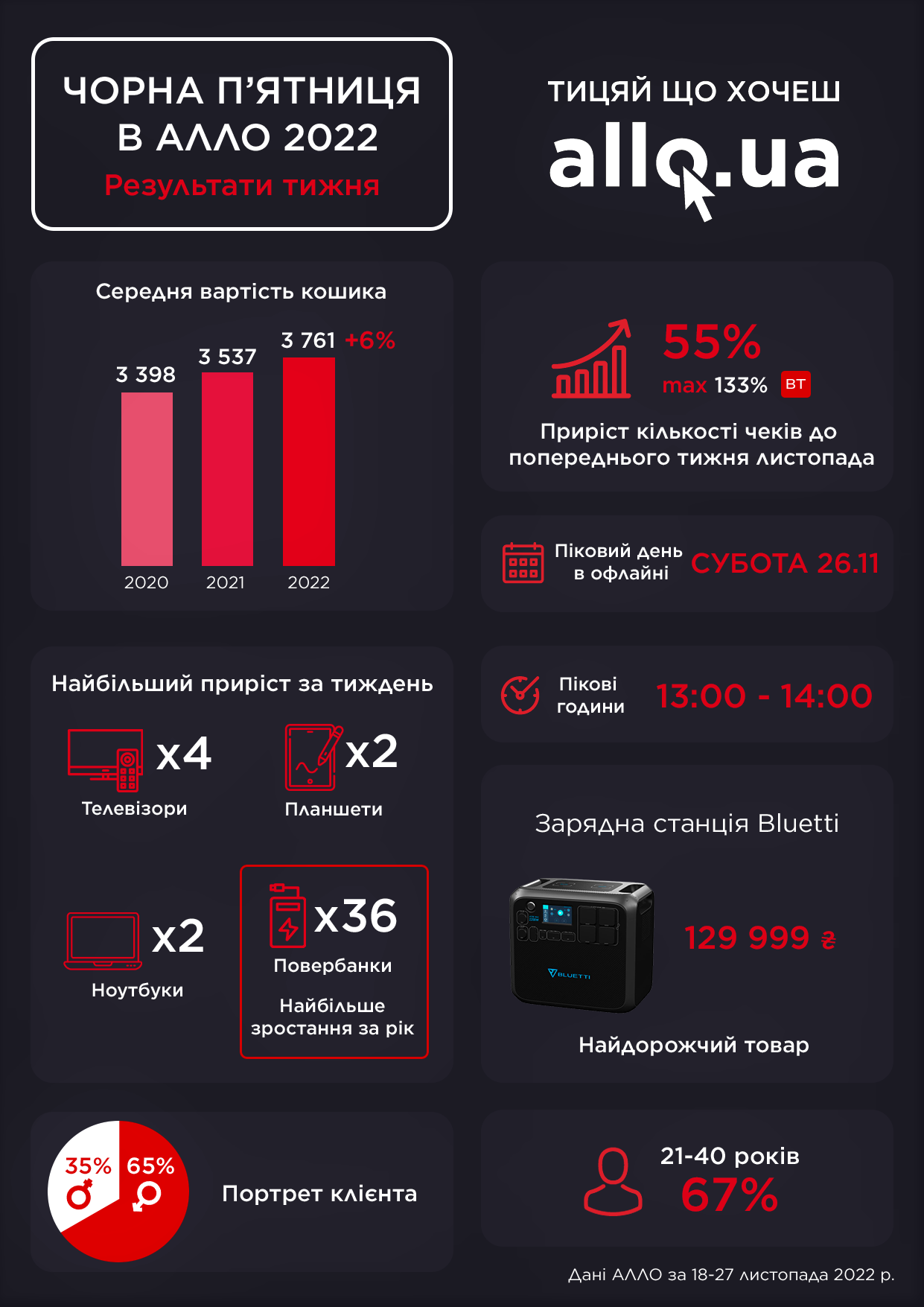 Офлайн-трафик в магазинах АЛЛО наиболее вырос по сравнению с обычным днем ноября в среду днем — в 2,5 раза, а на следующий день резко упал. В пятницу, 25 ноября, количество посетителей увеличилась почти в два раза по сравнению с обычной пятницей ноября. Но пиковым днем недели стала суббота. По сравнению с 2022 годом онлайн-трафик в АЛЛО за неделю этого года был меньшим на 15%. Чтобы продолжать работу, компания во время блэкаутов обеспечила бесперебойную работу более 100 шоурумов и точек выдачи маркетплейса по всей Украине.