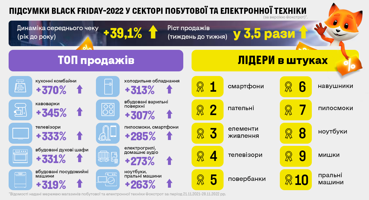Всеукраинский ритейлер Фокстрот подвел итоги громкой акции года и назвал список самых популярных товаров распродажи. Товарооборот компании в неделю Black Friday вырос в 3,5 раза по отношению к предыдущей неделе, средний чек увеличился на 39% по сравнению с прошлогодним.