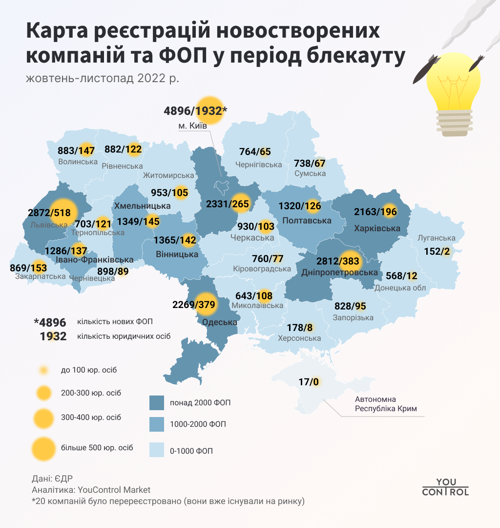 Наиболее активной из регистраций нового бизнеса традиционно оказалась столица. В Киеве с 1 октября по 30 ноября было зарегистрировано почти 2 тысячи компаний и 5 тысяч ФЛП. Это 35 и 15% соответственно. В тройку лидеров среди создания предприятий попали также Львовская (9,4%) и Днепропетровская область (7%). Среди ФЛП на втором месте после Киева оказалась Львовская область (8,6%), а на третьем — Днепропетровская (8,4%).