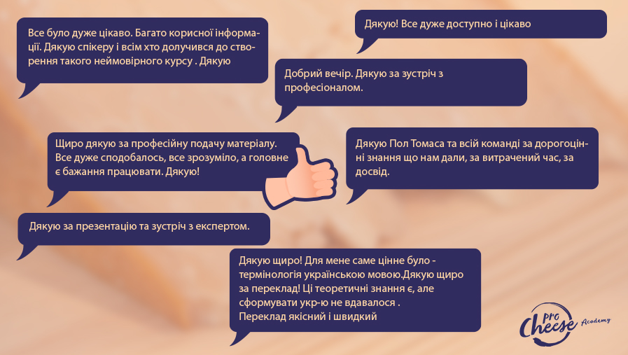 Чтобы поддержать украинских сыроделов и помочь им получить знания от мирового эксперта, лекции были бесплатными и проводились в удобном формате вебинаров. Также на курсе был доступен синхронный перевод учебного материала на украинский.