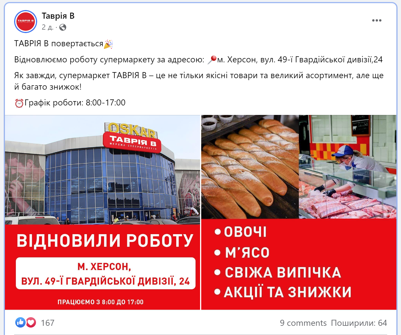 Недавно была возобновлена работа гипермаркета «Таврия В», расположенного в торговом центре OSKAR на улице 49-й Гвардейской дивизии, 24. Указанный магазин открылся в этой локации еще в феврале 2014 года, но был вынужден временно прекратить деятельность во время оккупации. О возобновлении его работы сообщили на официальной странице сети «Таврия В» в Facebook.