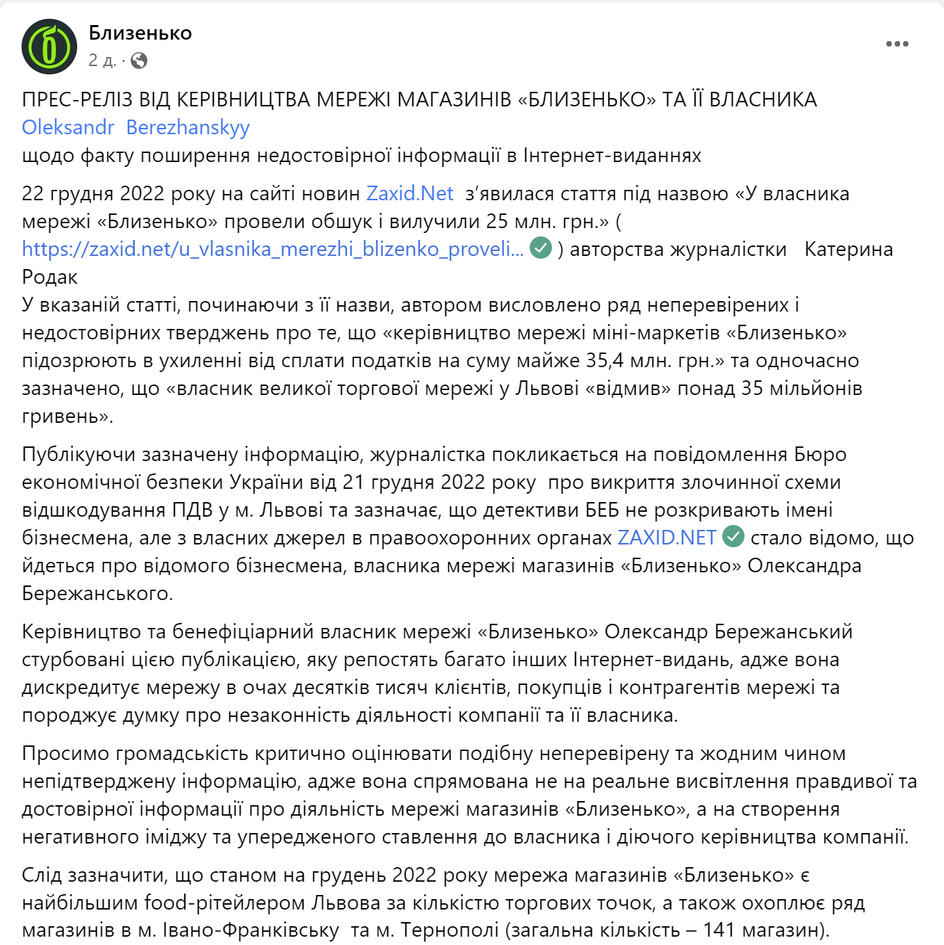 Бенефициарный владелец сети маркетов «Близенько» Александр Бережанский отреагировал на распространенную одним из интернет-изданий информацию о причастности компании к схемам незаконного бюджетного возмещения НДС.