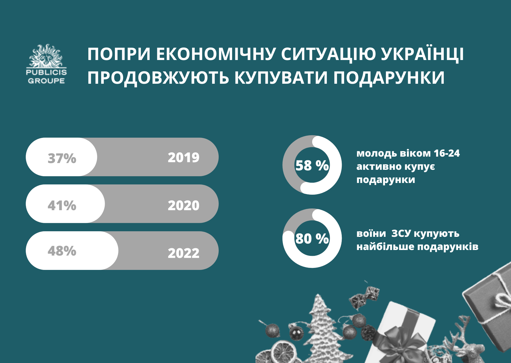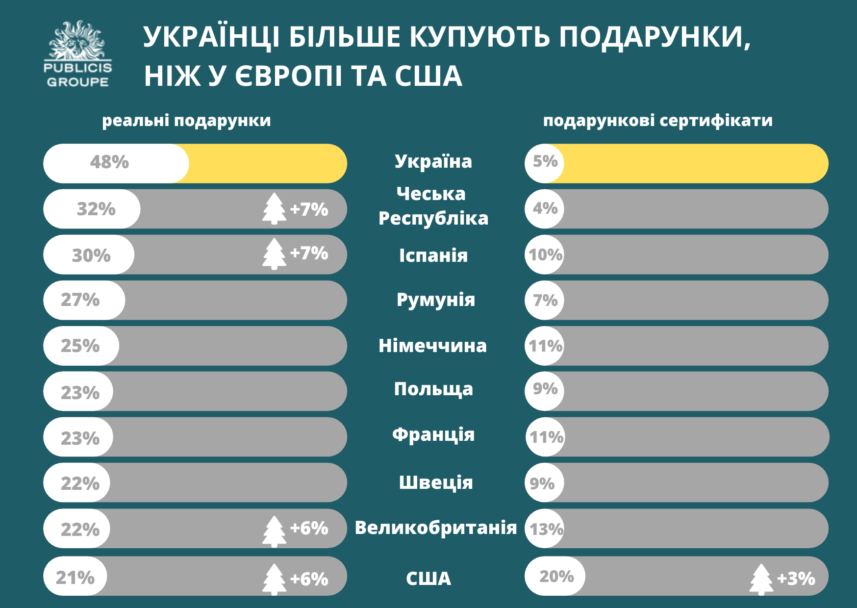 Данные комплексного социологического исследования Pace Panel, проведённого Publicis Groupe Ukraine вместе со всемирно известной исследовательской компанией Global Web Index, показали, что 48% украинцев продолжают дарить подарки. И этот показатель выше, чем в Европе и США, ведь в Чешской Республике 32%, в Испании 30%, а в США 21%. Здесь и дальше речь о доле пользователей, а не о количестве или сумме затраченных средств.
