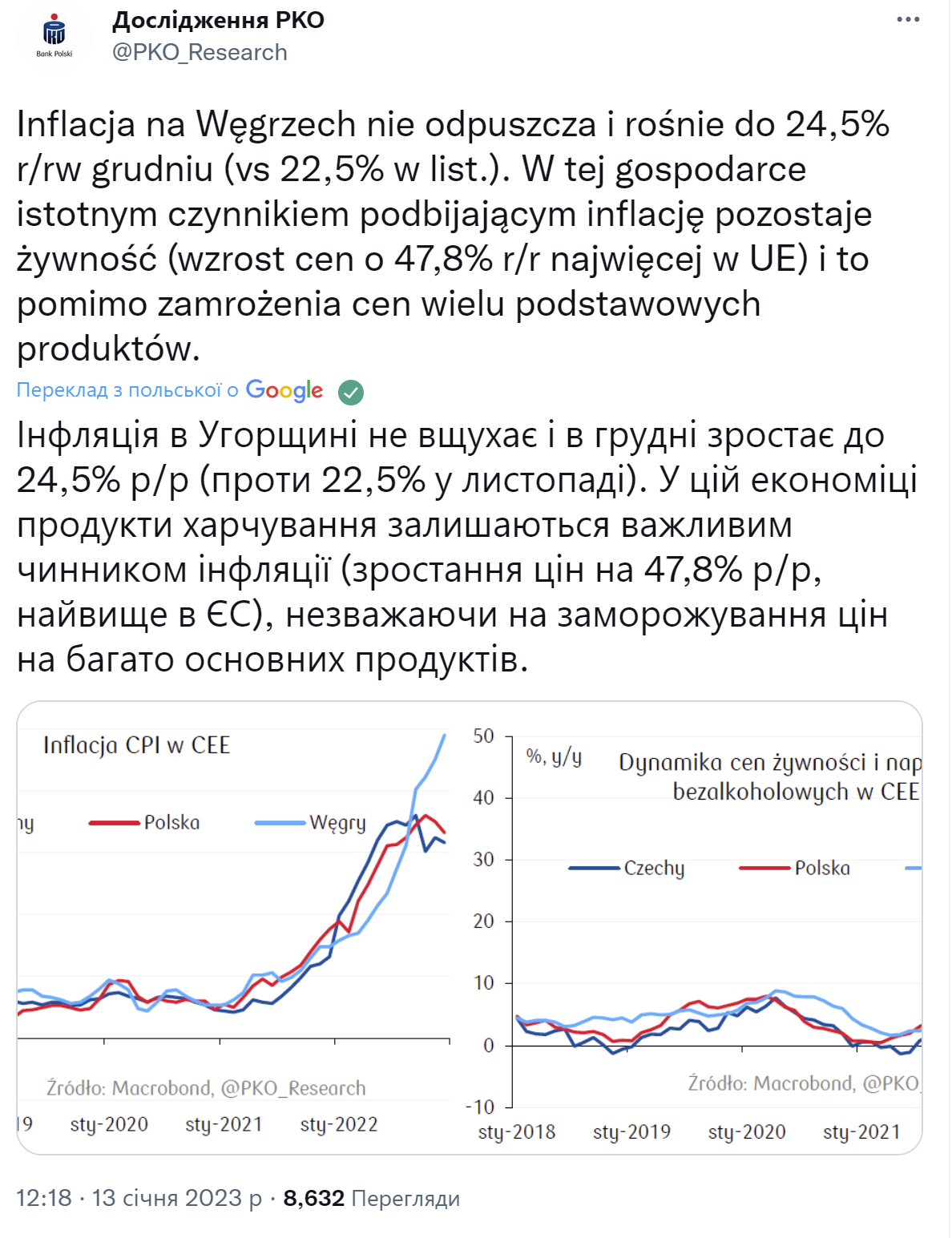 Цены на продукты питания выросли почти на 50% (наивысший показатель в Европейском Союзе), что повлекло за собой рост инфляции в Венгрии. В ноябре показатель ИПЦ составил 22,5%, а в декабре уже 24,5% в годовом исчислении.