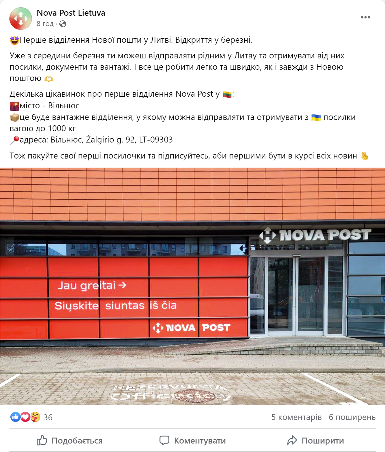 Первое отделение Nova Post будет открыто в Вильнюсе. Это грузовое отделение, в котором можно отправлять и получать из Украины весом до 1000 кг. Его адрес: Вильнюс, Žalgirio g. 92, LT-09303.