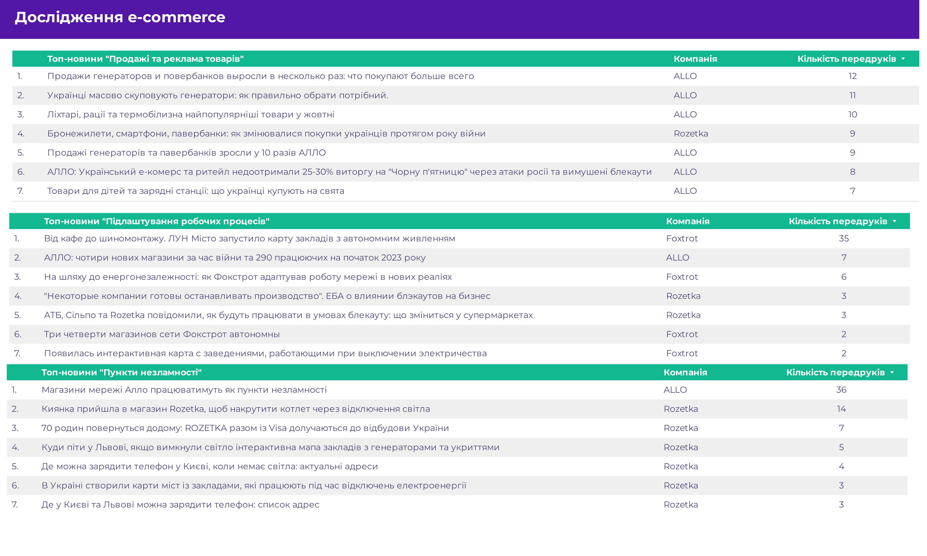 Большая часть физических магазинов превратилась в полноценные «Пункти незламності». Пик публикаций об этом выпадает на 19 декабря, когда ALLO выпустили релиз об установке генераторов в своих магазинах. Но в общей сложности наибольшую долю, а именно 40%, в этой тематике занимает Rozetka. Среди ее топ-новостей история о киевлянке, пришедшей в магазин накрутить котлет; анонс совместной с Visa инициативы по восстановлению жилья; а также — списки актуальных адресов, где можно зарядить телефон.