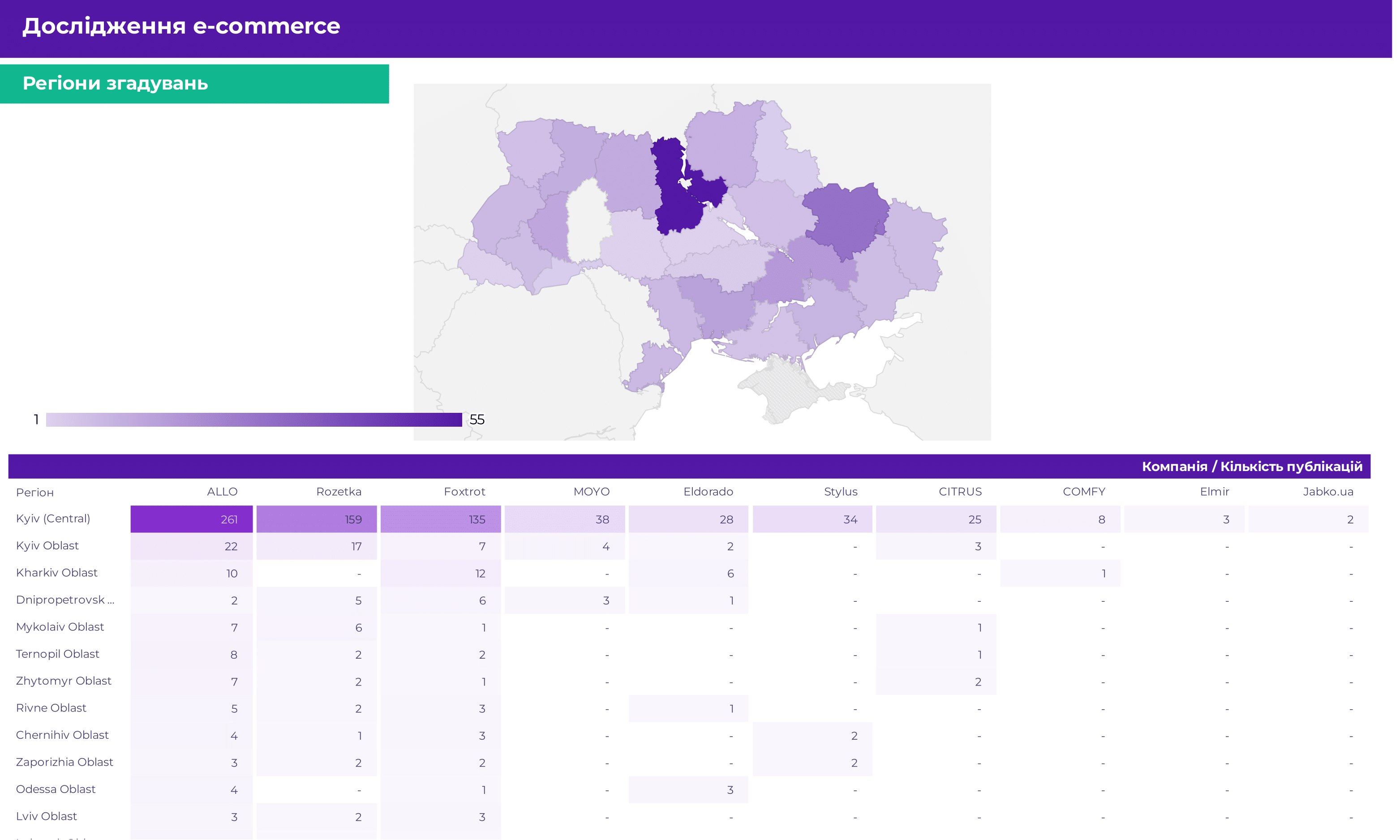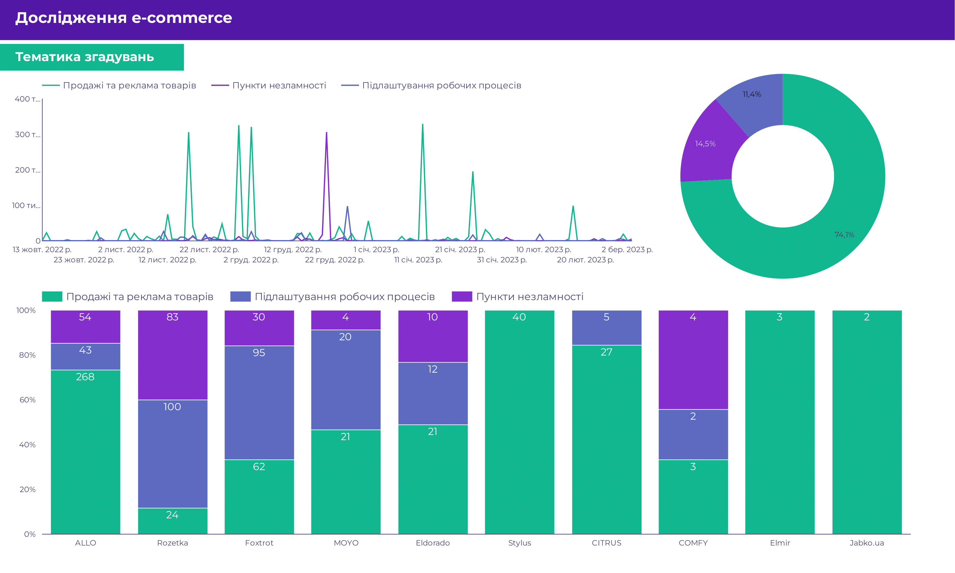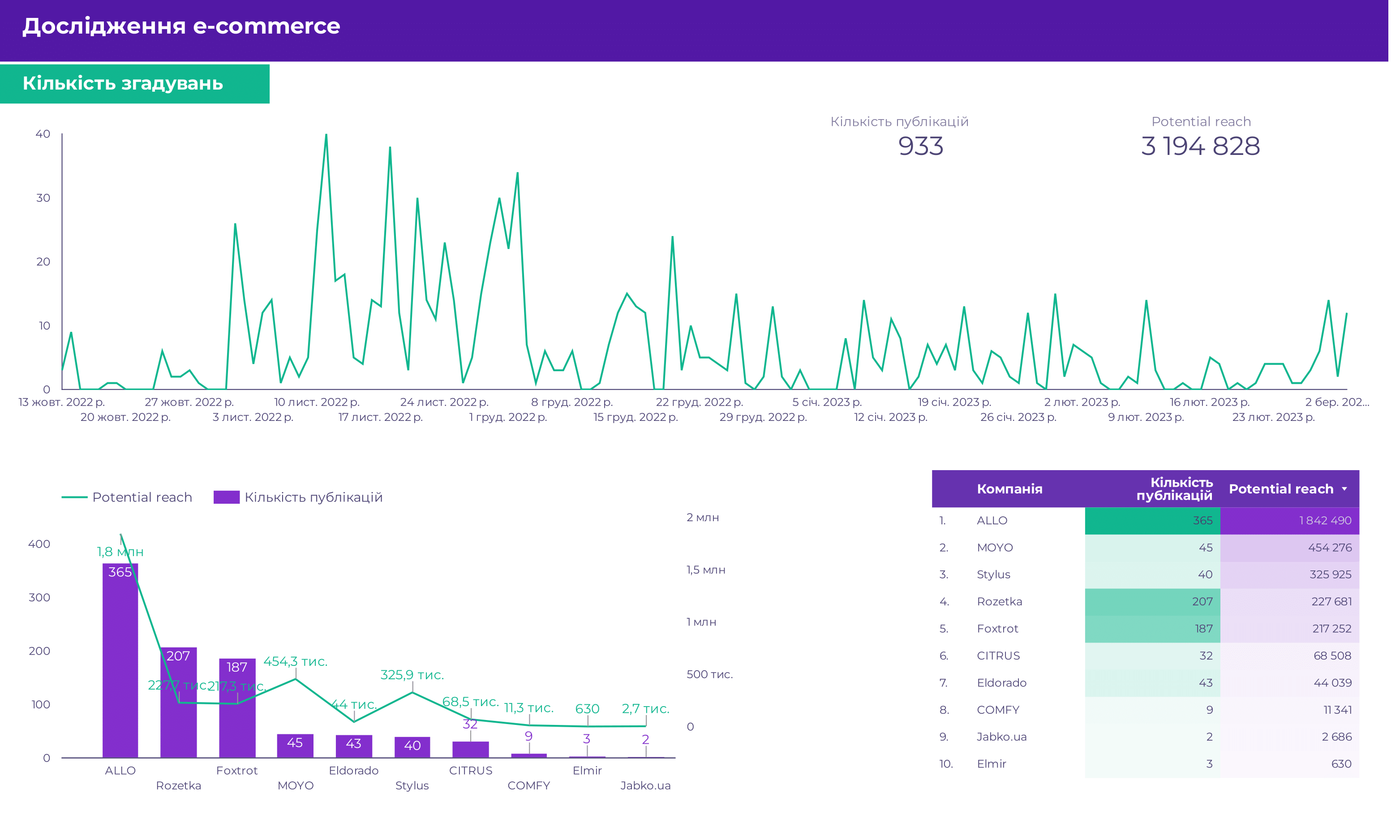 За период с 11 октября по 2 марта публикации рынка e-commerce с привязкой к теме отключений света и обстрелов критической инфраструктуры, охватили почти тысячу публикаций и получили чуть более трех миллионов потенциального охвата. Лидерами по числу публикаций стали магазины: ALLO, Rozetka и Foxtrot. Далее следуют: MOYO, Eldorado, Citrus и другие. За потенциальным охватом MOYO и Stylus опережают Rozetka и Foxtrot. В основном из-за большей частоты публикаций на своих сайтах.