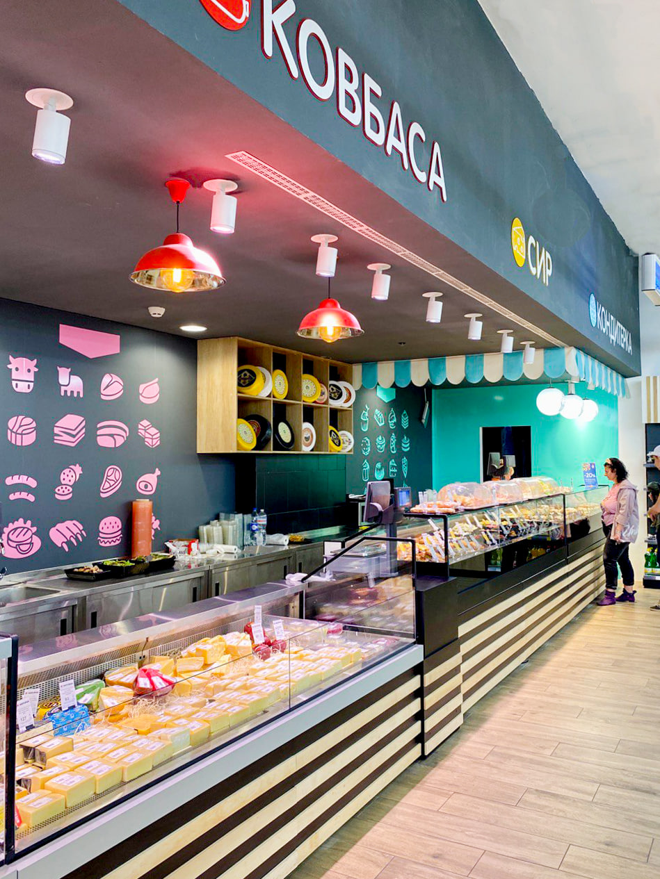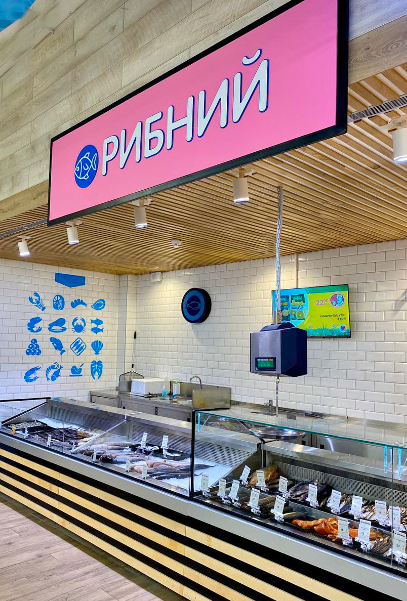 В оформлении нового магазина использован ряд инновационных решений. Яркая навигация в розовой цветовой гамме призвана помочь покупателю быстро и легко найти нужные продукты и добавить визуальную привлекательность в процесс выбора. Атмосфера рыбного отдела дополнена яркими рисунками на морскую тематику, а изящества и шарма кондитерскому отделу добавляют яркие маркизы и дизайн в стиле европейской лавки. Магазин оформлен в светлых тонах, что делает его просторным и привлекательным для посетителей.