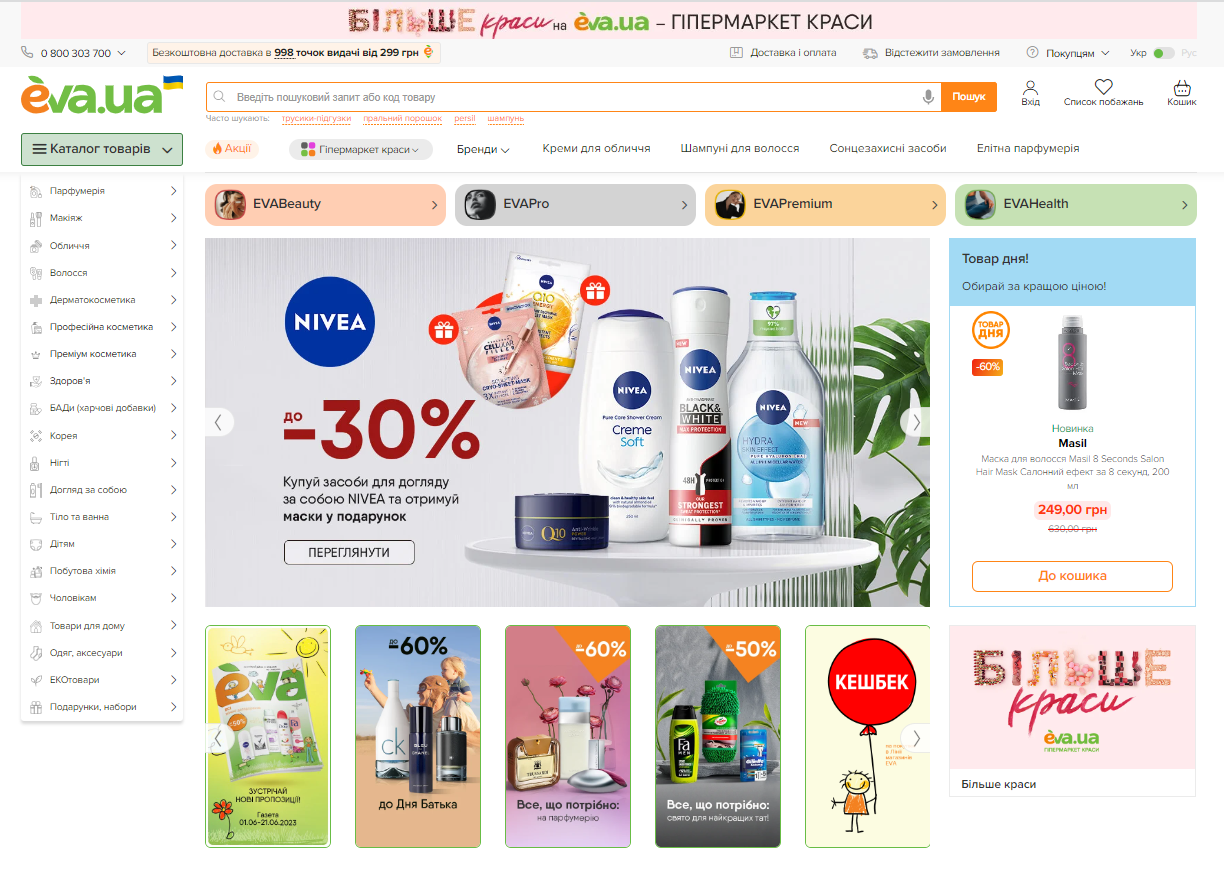 Интернет-магазин EVA.UA компания открыла почти шесть лет назад, а теперь он превратился в гипермаркет красоты. В нем можно приобрести товары четырех основных категорий — для красоты, здоровья, ухода за домом и для детей. Ассортимент насчитывает уже 100 тысяч наименований продукции и это только первый шаг, потому что он постоянно расширяется, отмечает Елена Анненко. Кроме привычных для покупателей EVA товаров, в гипермаркете красоты можно найти широкий ассортимент профессиональной косметики, продукции премиального сегмента и для здоровья, однако речь не идет о рецептурных препаратах.