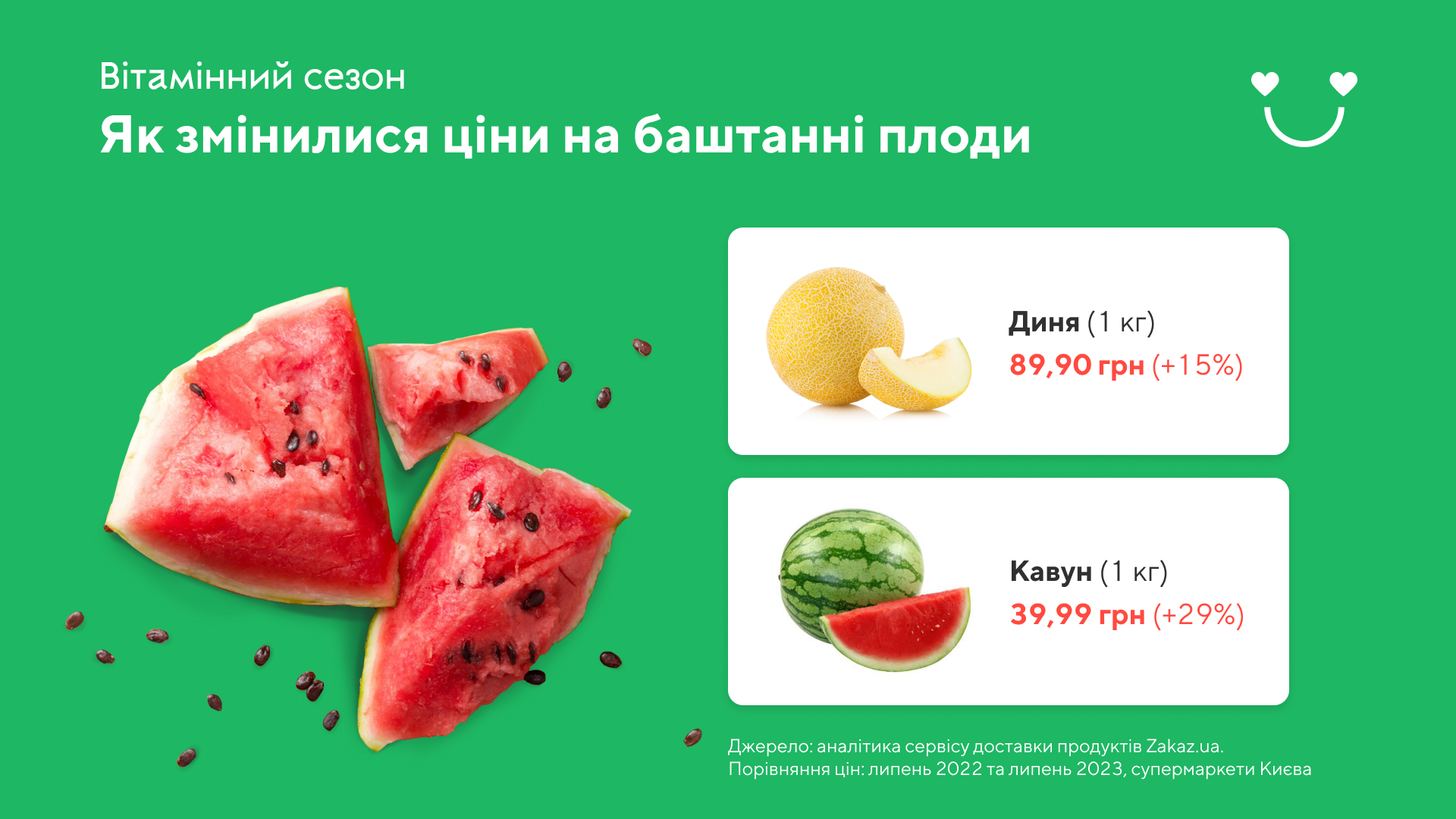 Арбузы и дыни также уже появились в магазинах, но пока их покупают не очень охотно. Люди ждут августовского урожая, надеясь на более низкие цены. Стоимость арбуза в столичных супермаркетах в среднем составляет 39,99 грн за килограмм, что на 29% выше, чем в июле прошлого года. В свою очередь цена на дыню выросла на 15%. В этом году она обойдется в среднем в 89 грн за 1 кг, тогда как в июле 2022 года цена составляла 78 грн/кг.