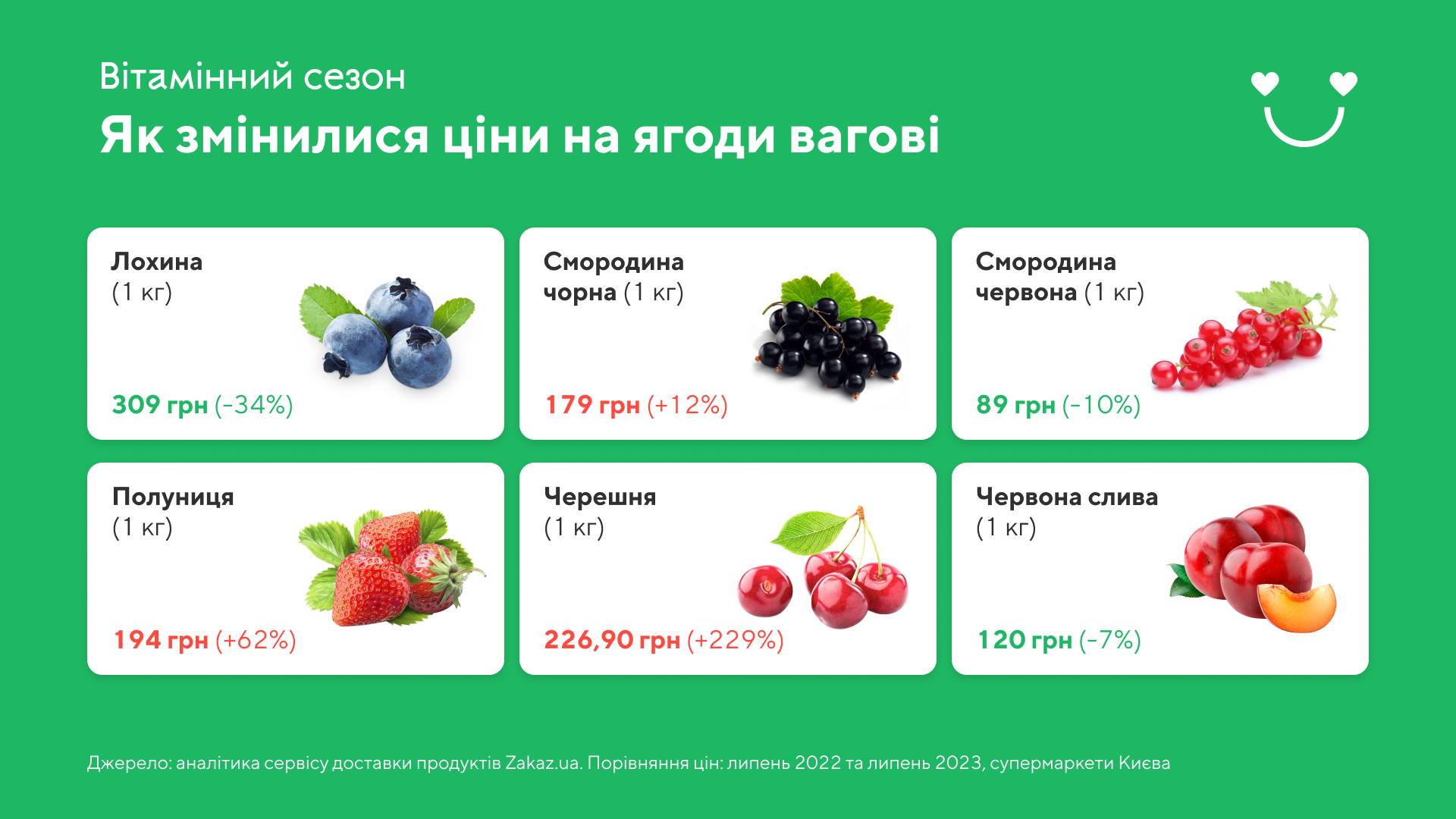 Согласно данным аналитиков Zakaz.ua, несмотря на замедление инфляции в стране, существенное подорожание все же постигло немалый ассортимент ягод в 2023 году. Больше всего подскочила в цене черешня: более чем в три раза — на 226%. На полочках супермаркетов ценник в среднем 226 грн/кг, в то время как в июле 2022 года цена составляла 69 грн. Также значительно выросла цена на клюкву. Кисленькие полезные ягоды в фасованном виде в этом году можно приобрести за 121,50 грн (350 г), что на 73% больше, чем в июле 2022 года. В частности, выросли в цене следующие ягоды: земляника — 129 грн за 125 г (на 34%), клубника —194 грн за 1 кг (на 62%), черная смородина — 179 грн/кг (на 12%), крыжовник — 97 грн за полкило (на 4%).