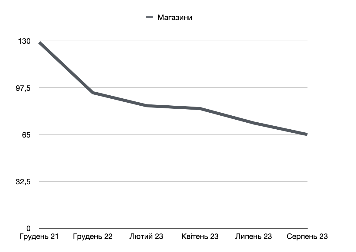 К декабрю 2021 года у компании было 129 магазинов. Однако с момента полномасштабного вторжения ситуация резко изменилась. К концу 2022 года закрылось 40 магазинов — часть из них была разрушена россиянами. В течение 2023 года сеть продолжает закрывать магазины. В настоящее время их осталось всего 65.