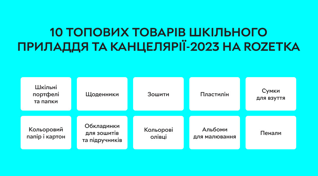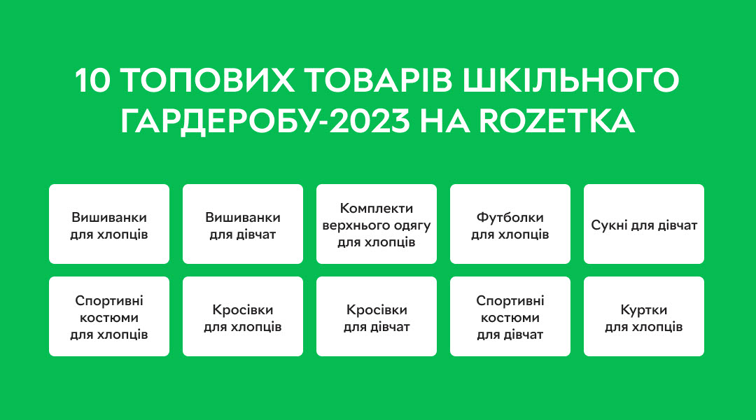В преддверии нового учебного года крупнейший украинский онлайн-ритейлер Rozetka поделился информацией о самых популярных товарах для школы. По состоянию на август 2023 года наибольшим спросом в этой категории пользуется одежда (в частности, вышиванки), а также школьные принадлежности.