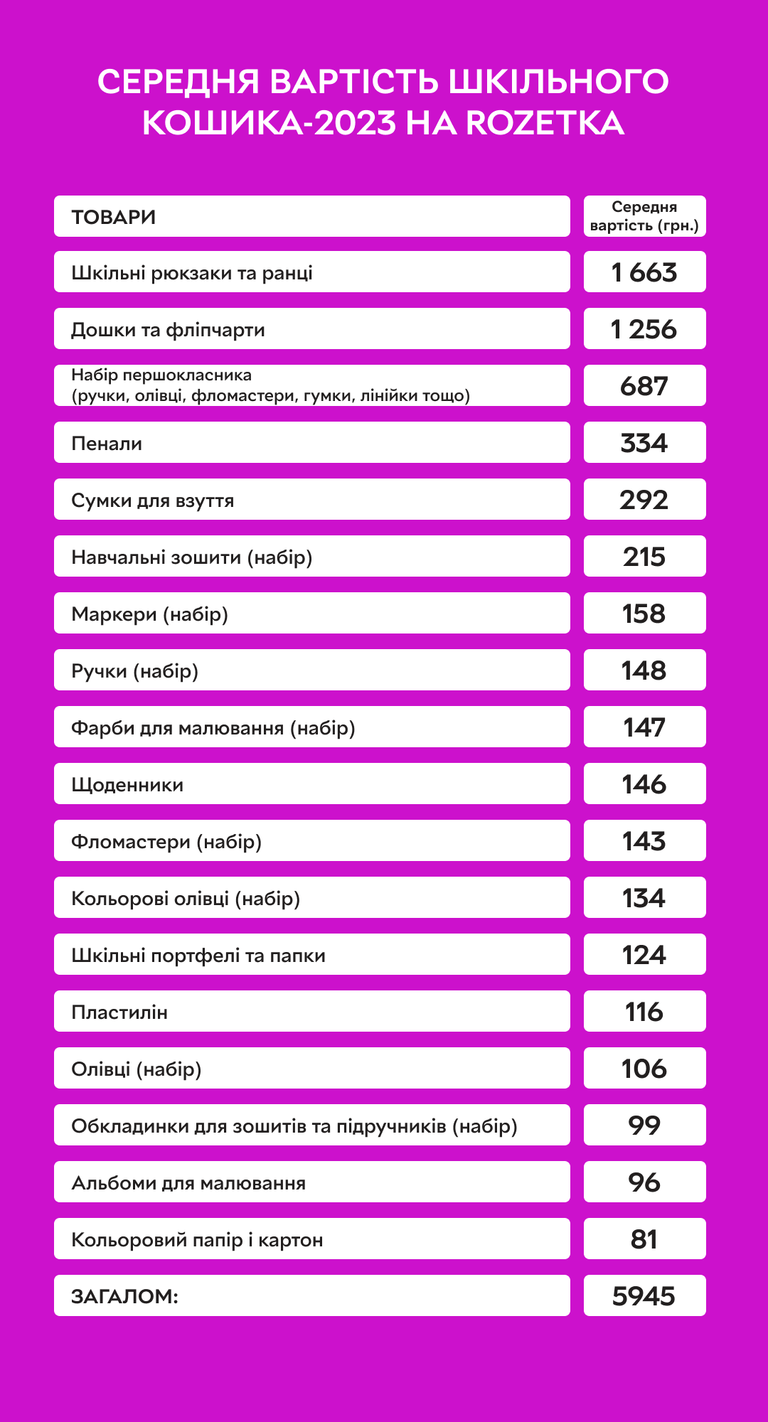 В 2023 году средняя стоимость школьной корзины на Rozetka составляет 5945 грн. Дороже всего обойдутся школьные рюкзаки и ранцы, доски и флипчарты и наборы первоклассника. Дешевле всего ― обложки для тетрадей и учебников, альбомы для рисования, цветная бумага и картон.