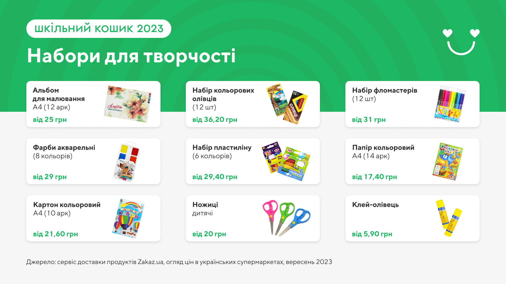 Что касается товаров для творчества, среди обязательных базовых атрибутов на уроки труда и рисования школьнику понадобятся цветная бумага, картон, карандаши, фломастеры, альбом, краски, ножницы и клей. Ниже в инфографике Zakaz.ua приведены минимальные цены на указанные товары, которые можно найти на полках в украинских супермаркетах.