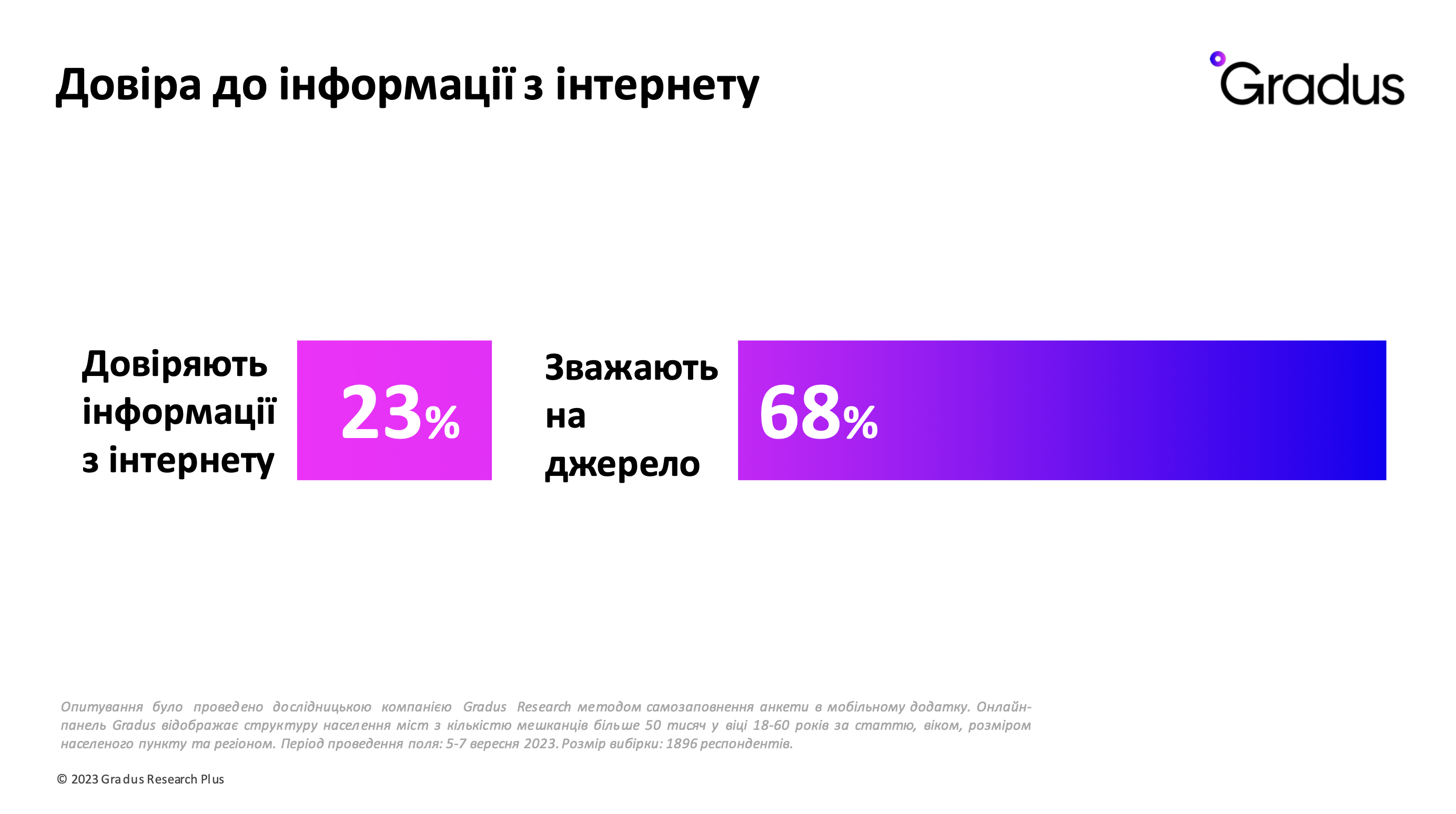 Перед началом войны в 2021 году исследовательская компания Gradus Research проводила обширное исследование Digi-нация, в котором исследователи смотрели, как люди пользуются интернетом и по каким сегментам их можно сгруппировать. В сентябре 2023 года Gradus Research повторили это исследование на выборке около 1900 респондентов, чтобы посмотреть на эти показатели в динамике.