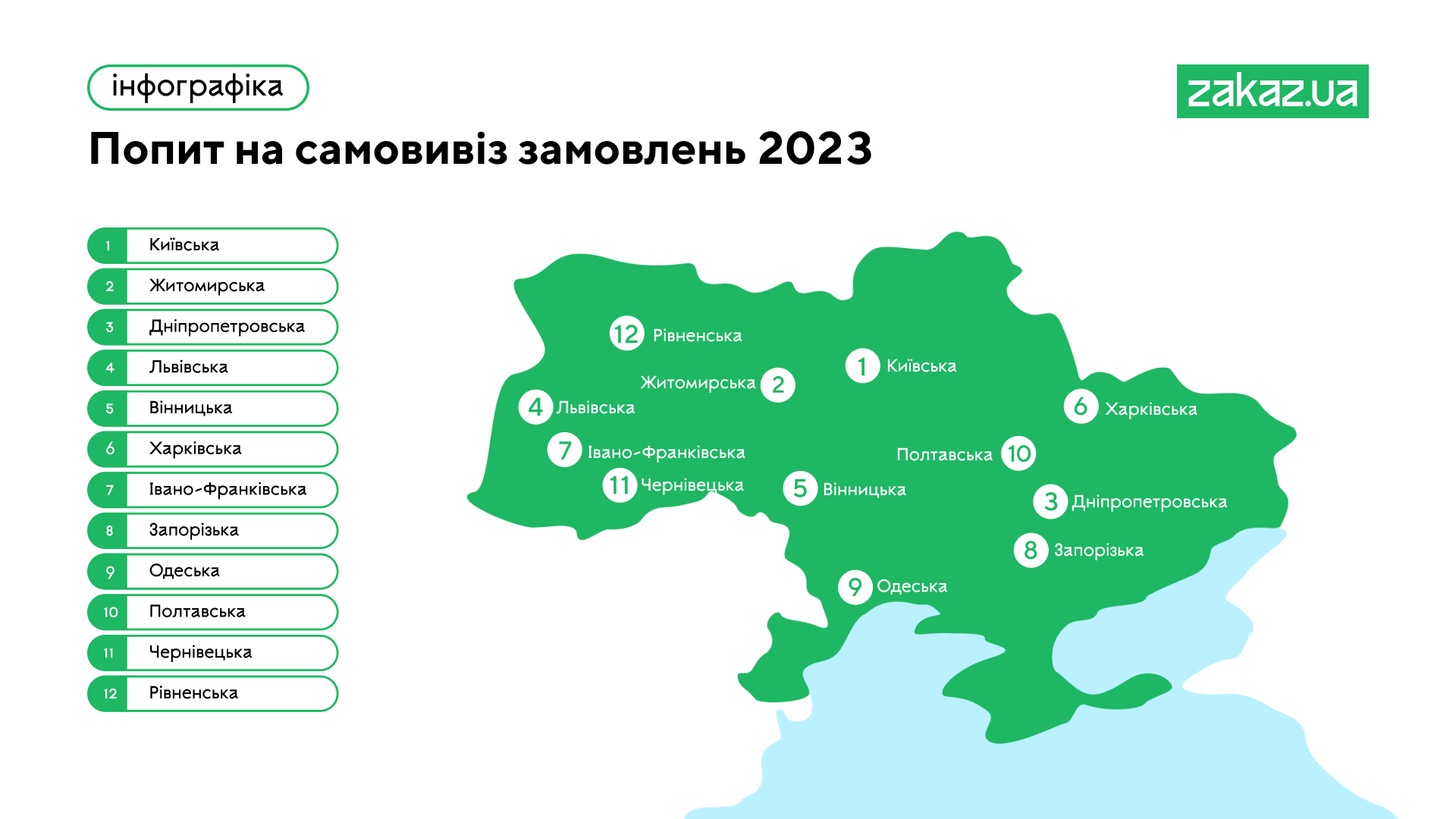 По аналитическим данным специалистов сервиса, в Украине в тройке лидеров по популярности услуги самовывоза в 2023 году есть Киевская (доля 65,18%), Житомирская (7,05%) и Днепропетровская (6,81%) области. Десятки тысяч жителей именно этих регионов чаще предпочитают самостоятельно забрать уже упакованный заказ на точке выдачи или паркинга в супермаркете. Пик наибольшего количества выдачи обычно приходится на вечернее время с 16:00 до 20:00.