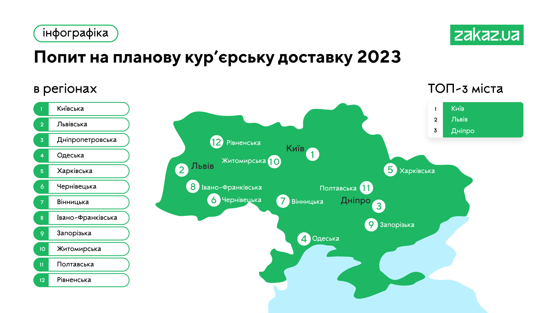 Наибольшую популярность услуга курьерской доставки пользуется в мегаполисах и городах миллионниках, где проживает большое количество населения и, соответственно, большой спрос. Особенно это касается Киевского региона, на который приходится доля в 62% заказов на плановую доставку. В частности это обусловлено тем, что именно в столице находится значительное количество магазинов партнеров-ритейлеров. Наибольшее количество заказов среди пользователей Zakaz.ua наблюдается в Киевской, Львовской и Днепропетровской областях, входящих в тройку лидеров.