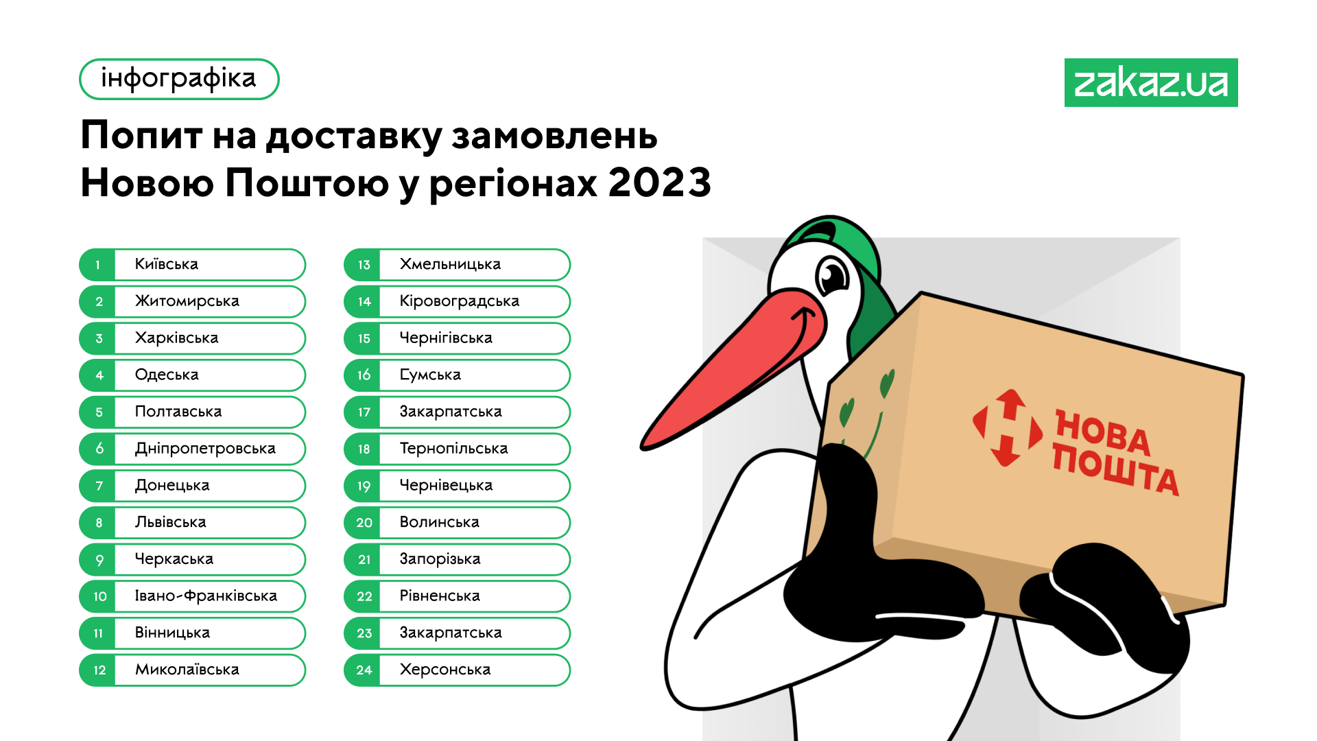 В Украине наибольший спрос на доставку заказов Новой почтой наблюдается среди жителей следующих областей: Киевская (доля 27,87%), Житомирская (11,12%), Харьковская (10,29%), Одесская (8,14%) и Полтавская (5,96 %). Меньше всего было доставлено заказов Новой почтой пользователям Zakaz.ua в Херсонскую, Закарпатскую и Ровенскую области, где доля не достигает и 1%.