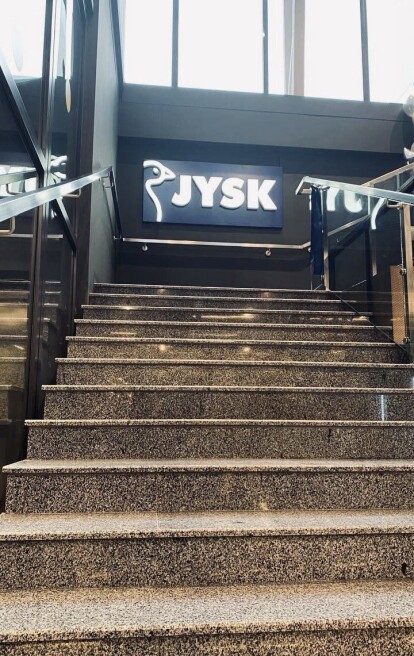 Новый магазин разместился на втором этаже торгового центра, поэтому имеет прекрасный вид, а также террасу для выставки садовой мебели, ведь новый сезон не за горами. Панорамная стеклянная витрина JYSK осматривается из окон соседних домов жилого комплекса.