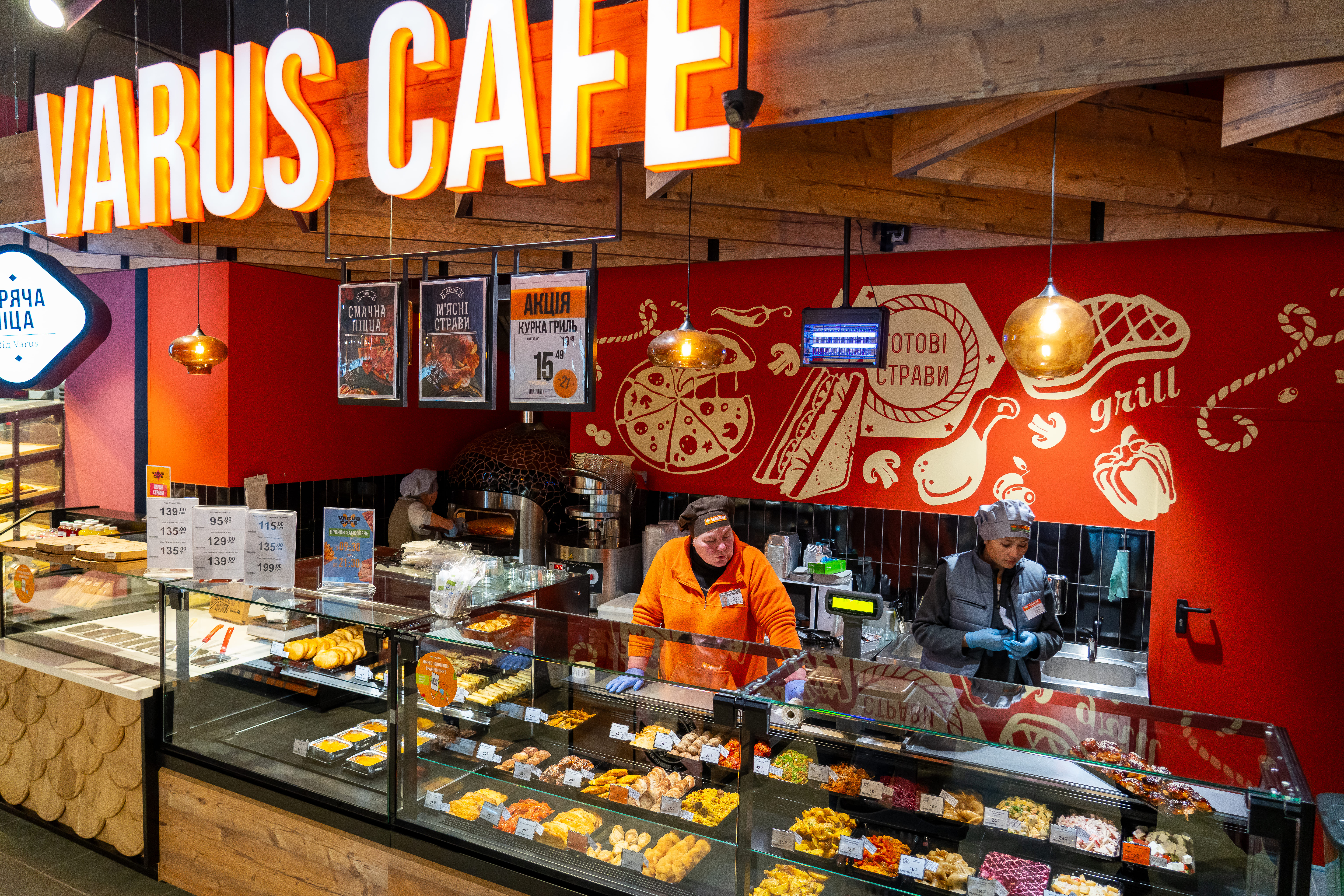 В новом магазине есть VARUS CAFE, где можно купить готовую еду, выпечку и фирменную пиццу с собой.