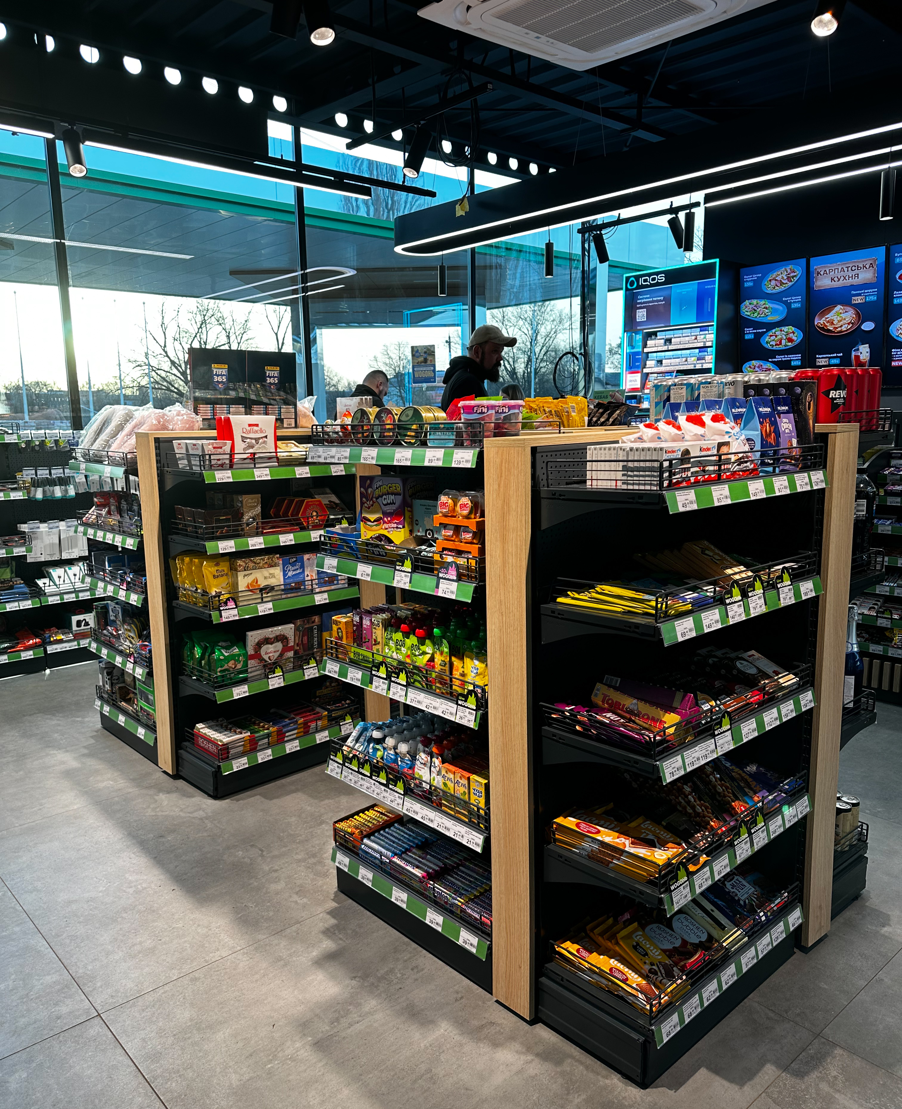 Пространство внутри АЗК организовано таким образом, чтобы максимально улучшить клиентский опыт. Визитная карточка WOG — кофе — имеет отдельно выделенную зону. Кофемашины расположены на специальном острове WOG Barista. Это позволяет улучшить эргономику приготовления кофейных напитков и развести гостевые потоки.