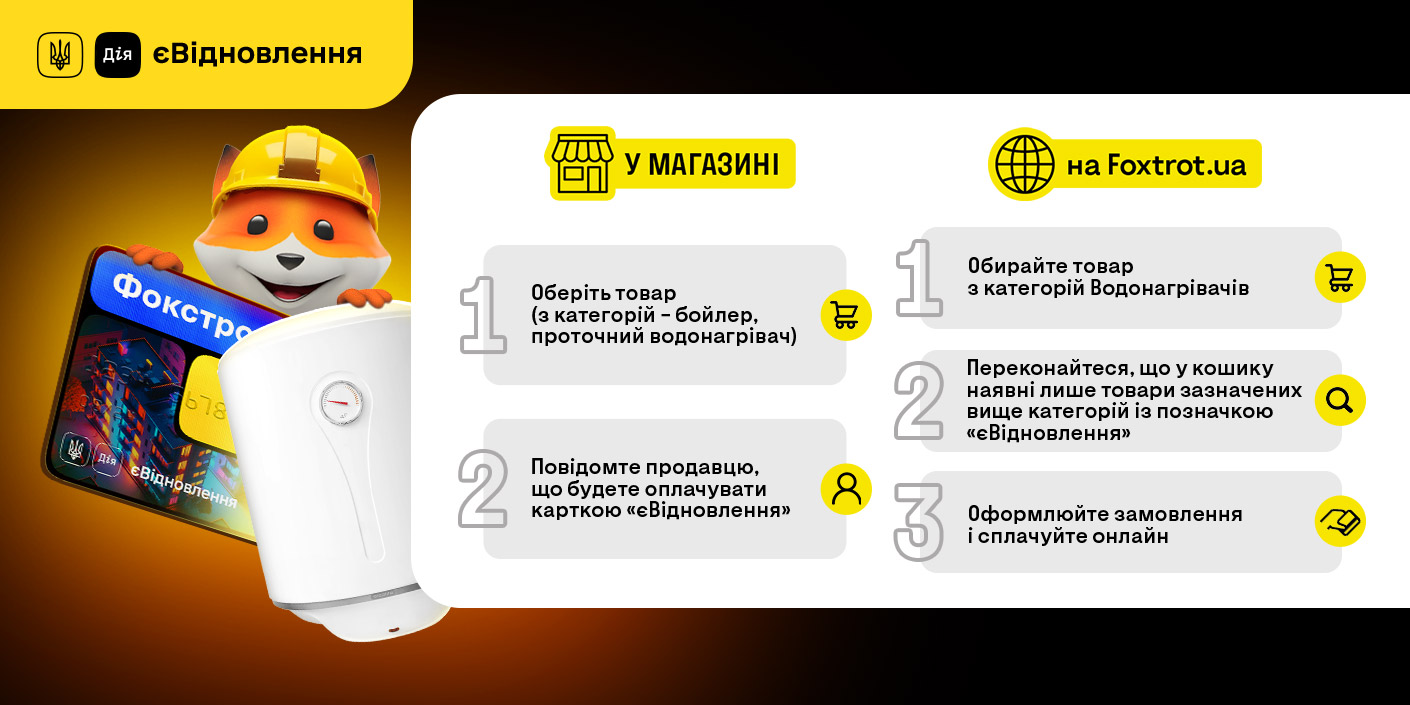 По программе «єВідновлення» в Фокстрот можно приобрести товары из категорий бойлеры (накопительные водонагреватели) и проточные водонагреватели.